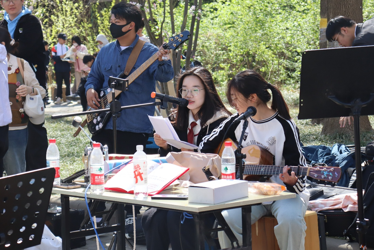 伴随着春风,萦绕在海棠季活动现场的还有阵阵音乐声。北洋口琴协会用轻声的口琴吸引着人们不近不远的驻足聆听,指尖弹动中北洋吉他协会的表演现场前面也围绕了许多音乐爱好者,i唱音乐社摊位前是许多跃跃欲试准备一展歌喉的师生、游客。音乐声传递着春日的温暖气息,也洋溢着大家的青春活力。