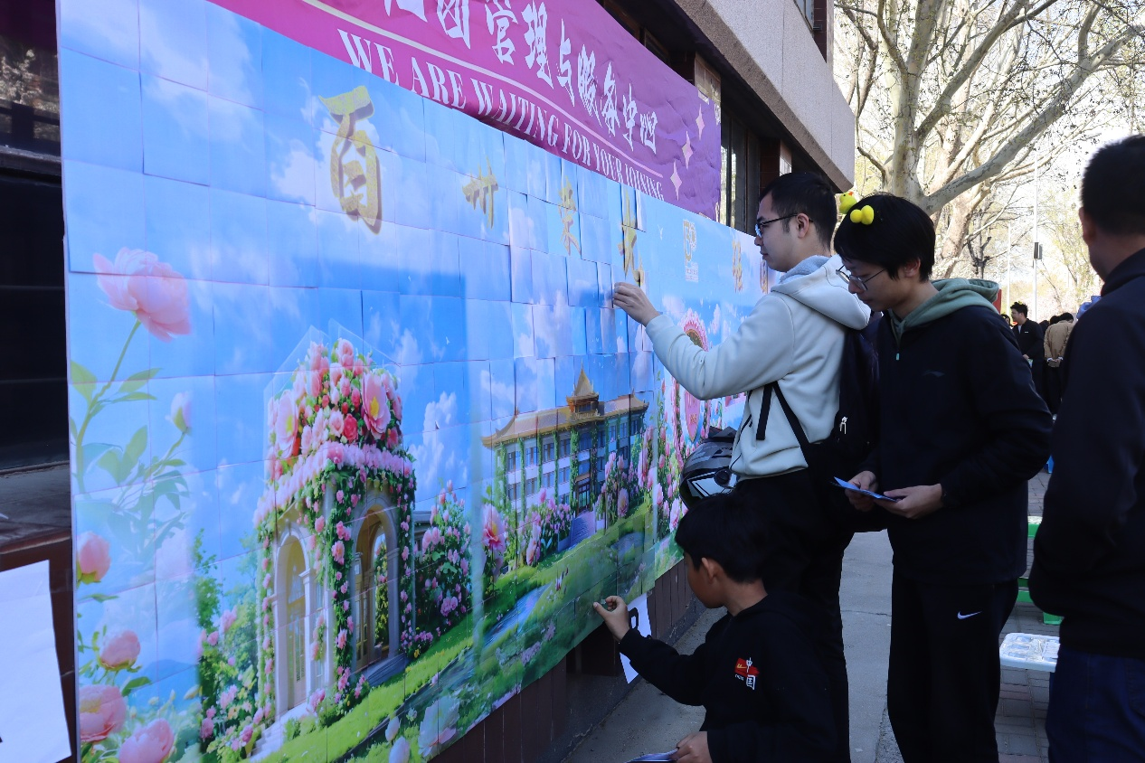 “咚、咚”的鼓声是最好的伴奏,天大廿四节令鼓队社团成员正在耐心地教着小朋友们;北洋工笔重彩协会前围绕着排队等待体验工笔绘画的人们,在绽放的海棠花下,北洋诗词社的易拉宝上写满了大大小小、承载着美好的诗词歌赋。文化气息融入了春日校园,参与者们在创造中感受艺术的魅力与乐趣。