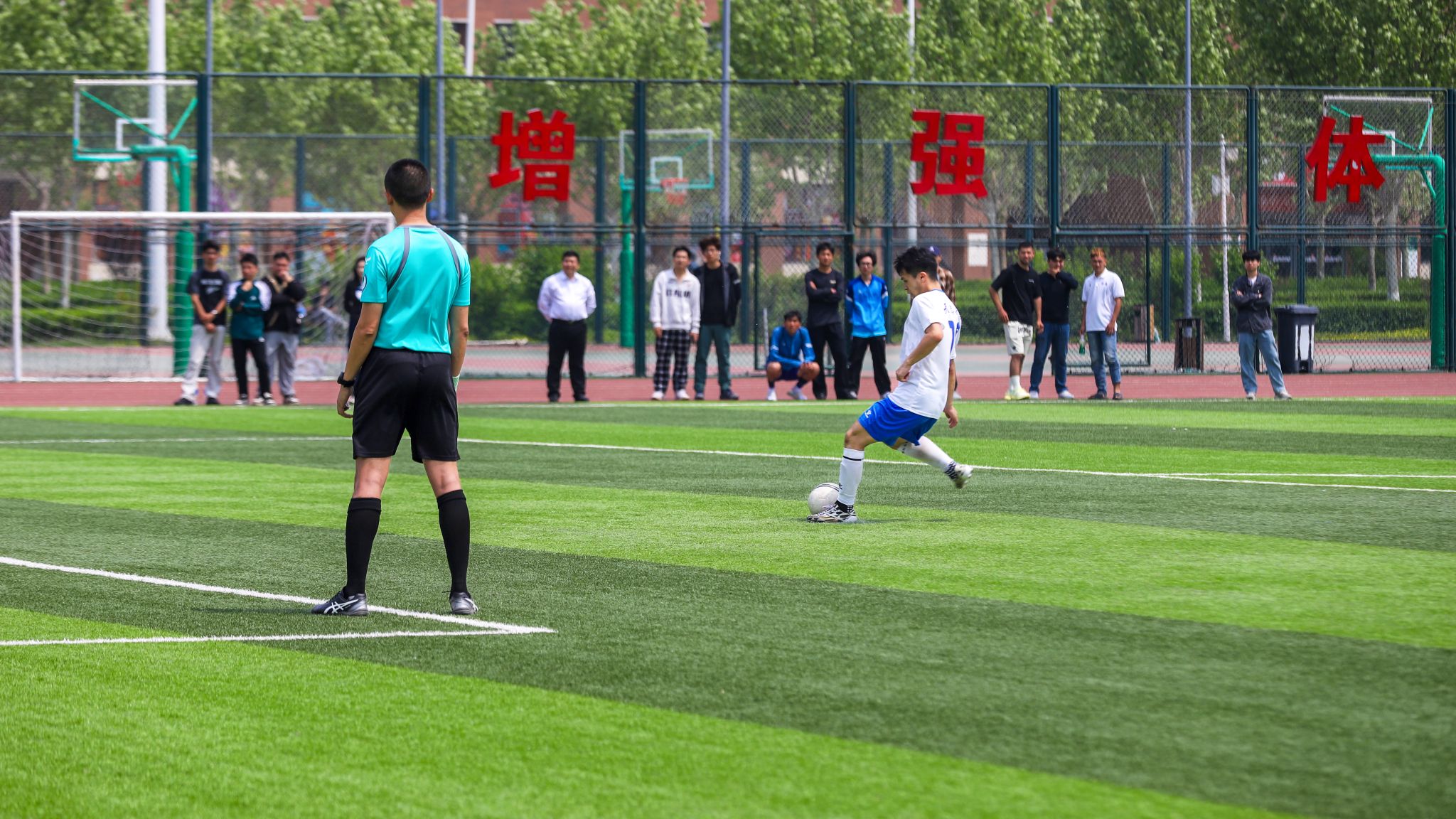 本场比赛,我校男子足球队在上半场被罚下一人的不利情况下,顽强拼搏,双方90分钟常规时间内战成平局。通过点球大战,最终以4比3战胜对手。
