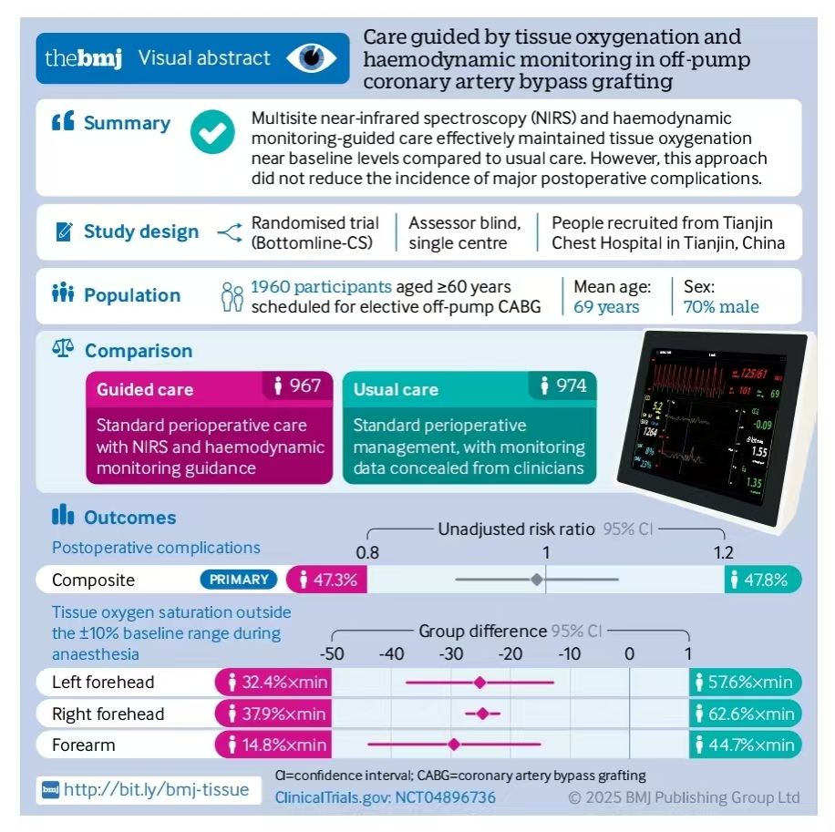 本站讯(通讯员 焦德芳)3月24日,天津大学胸科医院郭志刚教授、韩建阁教授团队联合美国印第安纳大学医学院孟令忠教授团队的研究成果《多部位组织氧与血流动力学监测在非体外冠脉搭桥术中的应用评估》在国际权威医学期刊《英国医学杂志》发表。该研究历时3年,全面客观评估了多部位组织氧监测结合血流动力学管理方法对择期非体外冠脉搭桥围术期管理中的实际效用,为心血管手术围术期精准管理提供了重要科学依据。
