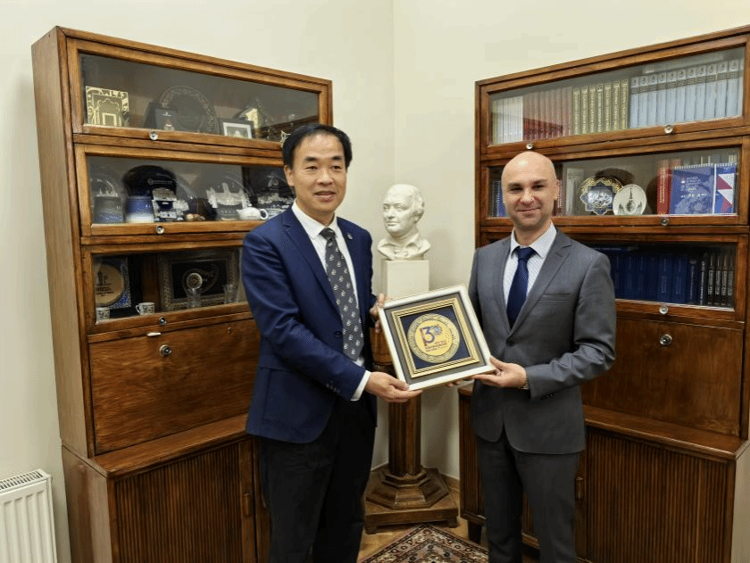 5月29日,代表团访问莫斯科国立大学,与副校长Yuri A. Mazei教授、国际发展部主任Igor P. Bochkov进行会谈。Mazei教授对代表团的来访致以热烈欢迎,并介绍了莫斯科国立大学的历史沿革、对华合作成果及全球化战略。双方肯定了近年来在精密仪器、应用数学领域的合作基础,规划拓展激光物理、基础数学等方向的联合研究,期待在已有合作的基础上,进一步加强新利18网址登录
