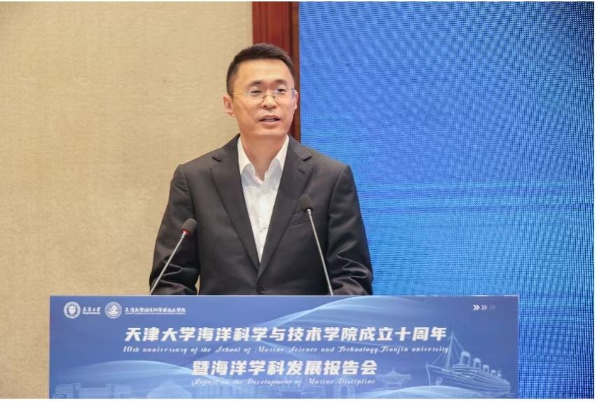 天津市科学技术局副局长谭振东祝贺海洋学院成立十周年,肯定了学院在科技成果转化方面取得的一系列成果。