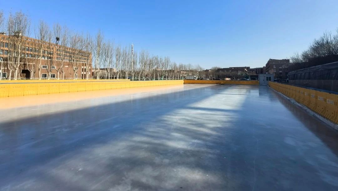 把55教北侧的混凝土路面“爆改”滑冰场,这背后饱浸着学校后勤工作人员“化身冰匠”的智慧和汗水。他们在凛冽寒风中继日地进行着冰场的浇筑与维护工作,还在冰场外围贴心地加装了水马围挡以及太阳能照明装置。