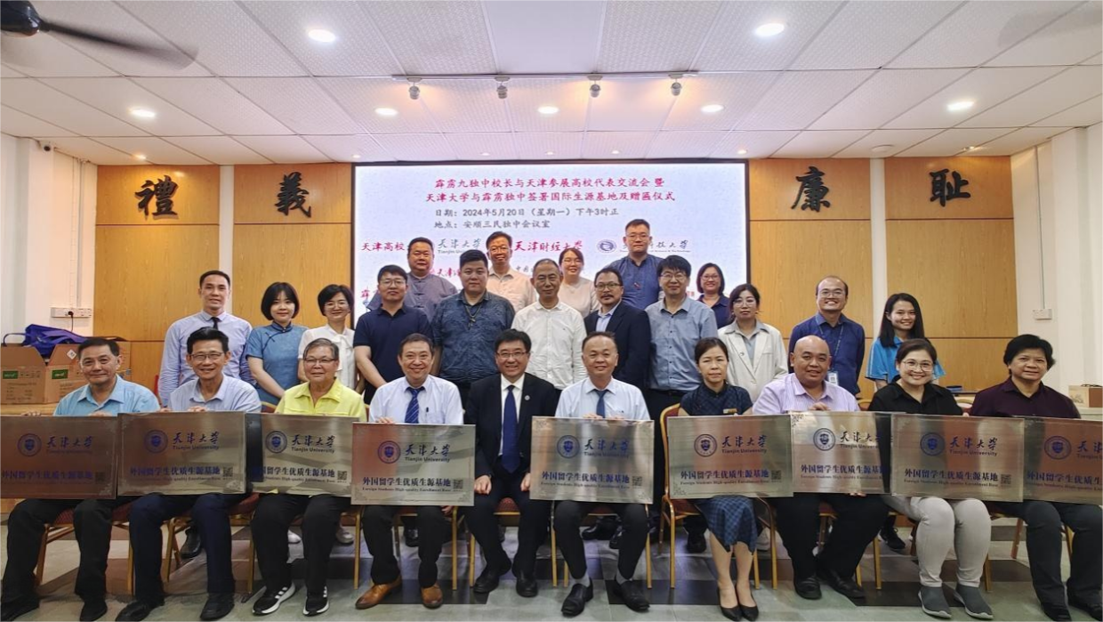 20日,我校组织中国民航大学、天津财经大学、天津科技大学、天津理工大学等天津高校与霹雳州育才独立中学、培元独立中学、太平华联独立中学、南华独立中学、崇华独立中学、培南中学、深斋中学、班台育青独立中学等9所中学校长就人才培养、师资培训及教育资源共享等议题进行交流,与育才独立中学、班台育青独立中学等4所中学签订升学合作协议,并授予霹雳州9所中学“天津大学外国留学生优质生源基地牌匾”。