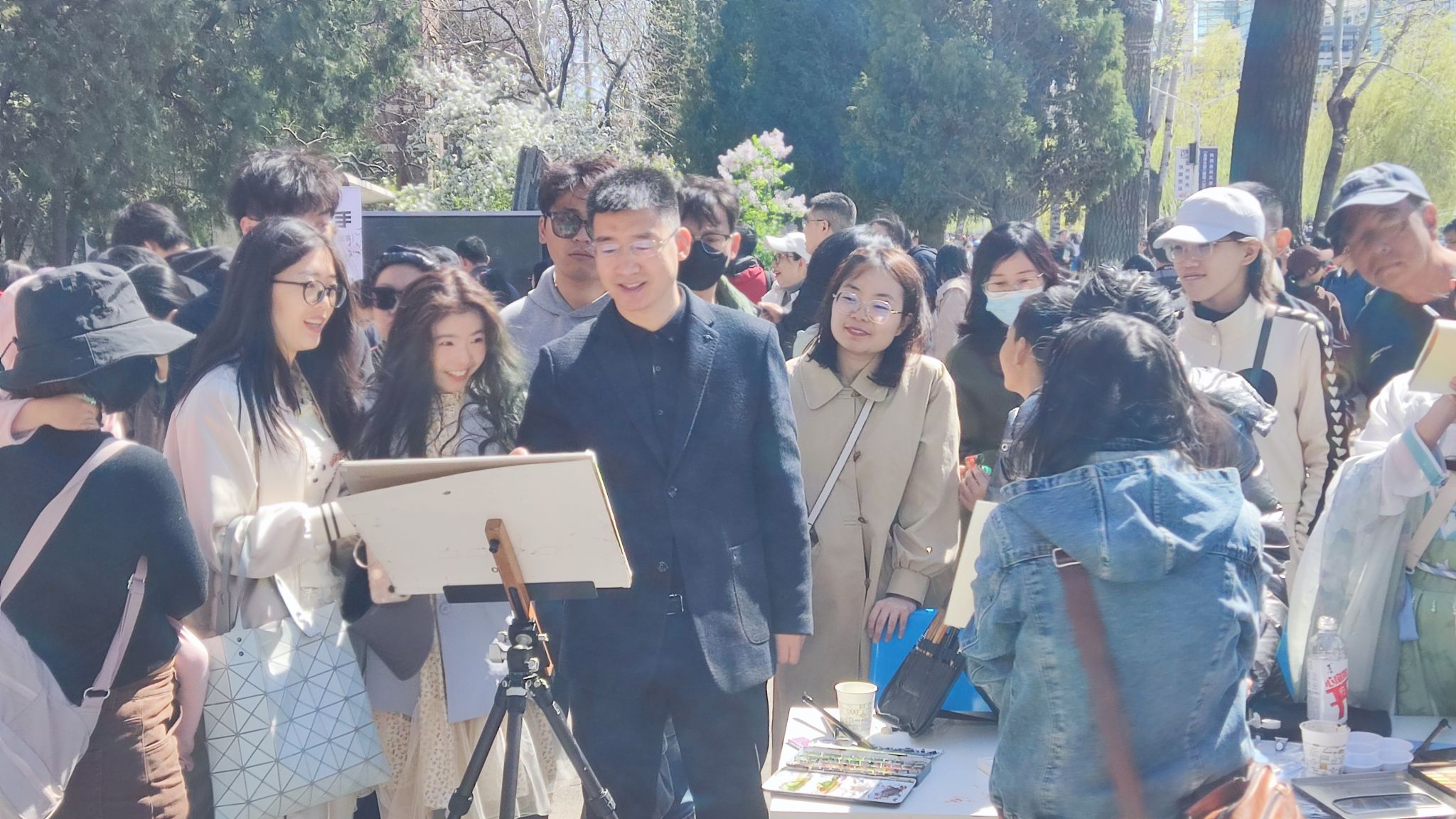 在春水图书馆前,“丹青与算法共舞”文化体验活动别开生面。建筑学院叶武老师现场指导手绘水彩,羊毫毛笔与宣纸间流淌出海棠春色。依托前沿人工智能技术,融入天大特色,AI绘画展位可实时生成游客心中的诗意画面——或是天大校园的巍峨地标,或是春日海棠的绚烂盛景。