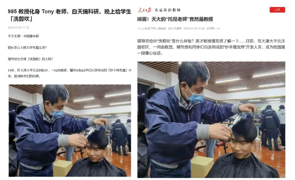 、晚上给学生“洗剪吹”》的推文火爆全网。其中的“Tony老师”就是曹树谦教授。原来,受疫情影响,学校实行了较长时间的封闭管理,同学们理发成了“头”等大事。为了解决这个难题,包括曹树谦老师在内有理发经验的师生就自发组成了义务理发队,为同学们理发。