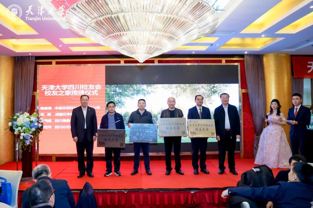 12月16日,杨贤金应邀出席天津大学四川校友会2023年会。四川省原副省长、天津大学四川校友会荣誉会长邹广严,四川省政协常委、天津大学四川校友会执行会长陈启章参加。杨贤金在致辞中对四川校友近年来在助力科技成果在蜀转化、开展招生宣传等方面所做的努力和贡献给予肯定,他着重从社会影响力、人才培养质量、科技创新实力等三个方面介绍了母校近年来的事业发展情况,感谢包括四川校友在内的海内外校友对母校一如既往的关心与支持。他指出,再过两年学校将迎来130周年华诞,希望各位校友们能够为校庆工作献计献策,学校将以130周年校庆为契机汇聚全球校友智慧力量,加快中国特色、世界一流大学建设步伐。年会上,杨贤金、邹广严为“天津大学四川校友会校友之家”揭牌,韩庆华、陈启章为12位校友颁发“天津大学金熊猫宣传大使证书。