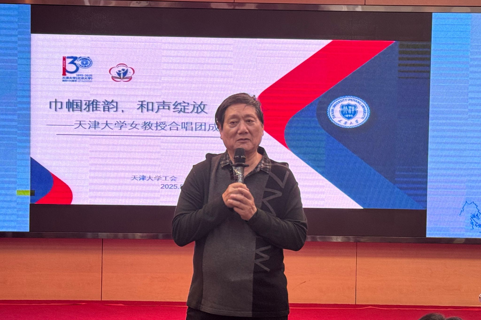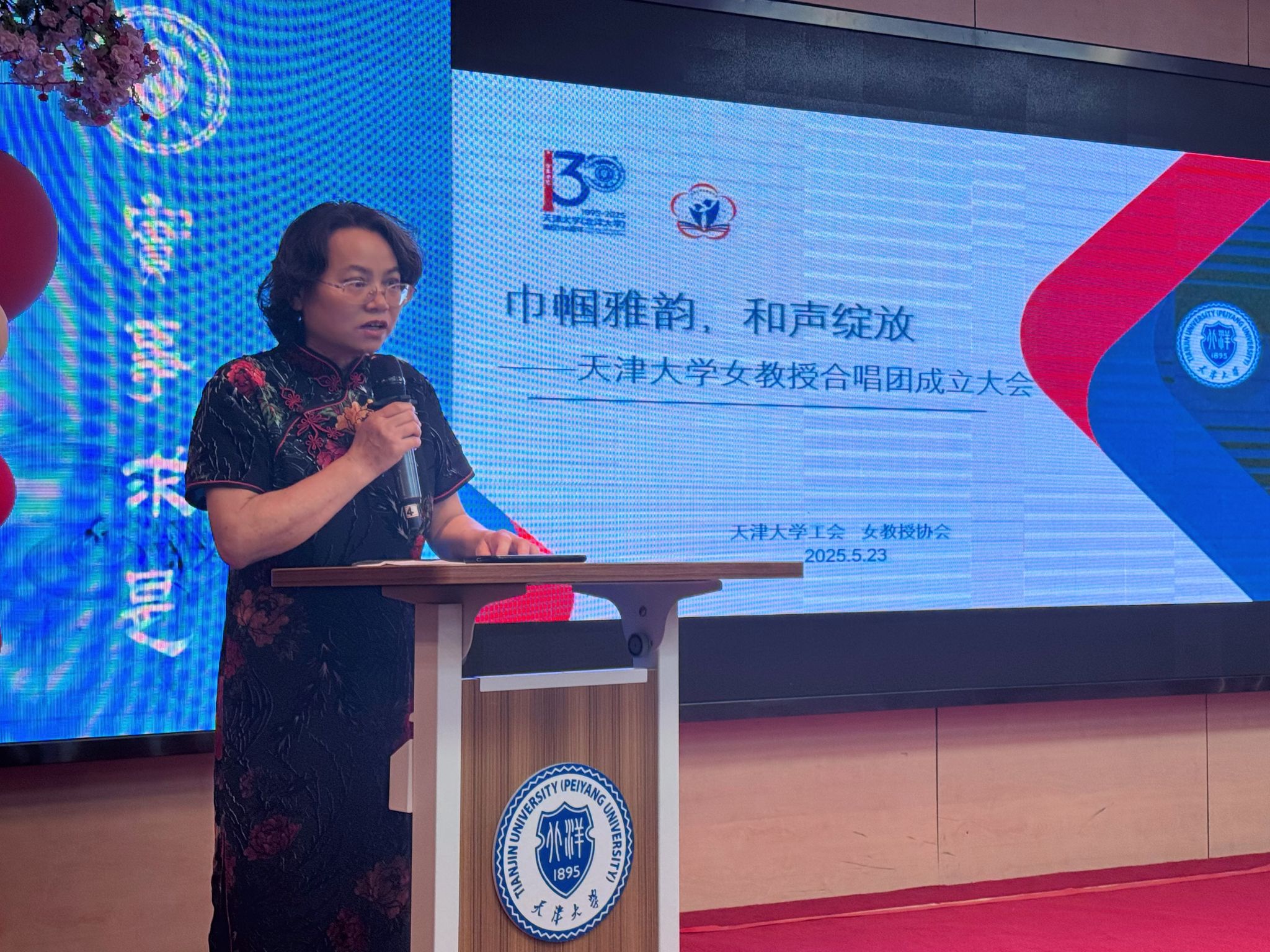 本站讯 (图/文李文宇)5月23日下午,“巾帼雅韵,和声绽放——天津大学女教授合唱团成立大会”在卫津路校区教职工文化活动中心隆重举行。校工会常务副主席宋雪峰、副主席魏欣,女教授协会理事会会长刘静,校艺术教育中心名誉主任、艺术总监任宝平等嘉宾与合唱团成员齐聚一堂,共同见证这一承载学术底蕴与艺术追求的校园文化新力量诞生。
