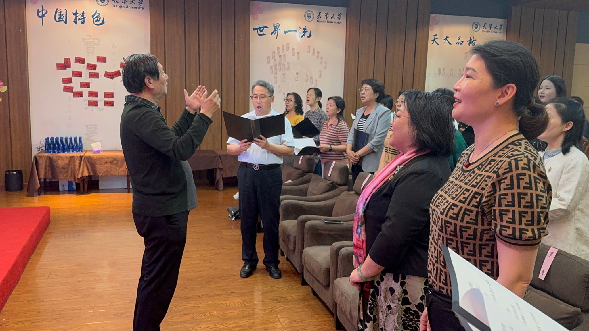 在节目表演环节,特邀艺术总监任宝平亲自指挥,合唱团全体成员共同演唱《天津大学校歌》与《我和我的祖国》。歌声悠扬,饱含深情,唱出了天大女教授们对学校的热爱与对祖国的祝福,展现出团队强大的艺术感染力。