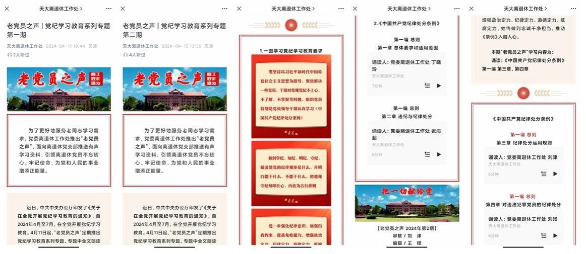 4月11日,学校党委召开动员会,系统部署党纪学习教育工作。党委离退休工作处积极迅速贯彻落实学校要求,当天就在微信公众号“老党员之声”专栏上推出党纪学习教育专题板块,组织力量依次接力为老同志们诵读并录制《中国共产党纪律处分条例》全文,与老同志一起原原本本学习《条例》,送学到老同志耳边。老同志们在学校动员部署当天就收到专属于他们的党纪学习教育“有声学习资料”后非常激动,学习热情高涨。他们认真收听,逐字逐句学、认认真真悟。老同志们表示:“听到同志们亲切的声音,切实感受到了党组织的温暖,学校党委的关怀!”