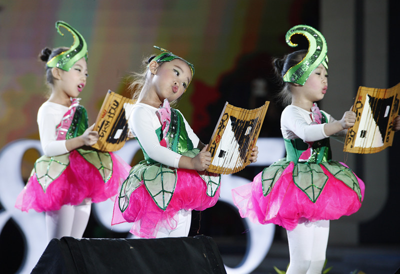 排练演出中的艰难可想而知,孩子们排练了半年,暑假也没有休息,暑假期间家长要每天送孩子到幼儿园排练,包括后来到新校区排练,要用好几辆大巴车把家长和孩子送到新校区,组织协调、安全保障,孩子们吃喝拉撒、换衣服、化妆……有时候排练还会冒点小雨,有的孩子还会发点小烧……现在想起来,还都觉得太不容易了,但是大家都齐心协力克服了。我印象特别深刻的是,第一次到新校区排练,家长和孩子都去,有家长在身边,孩子们特别不好组织,光这一个节目的演员就占用了好几个候场的大房间,这可急坏了我们后台工作组,设想若是演出当天,所有演员都到场的条件下,这一个节目的人员就几乎把整个候场区和楼道都占满了,哪里组织得清楚。