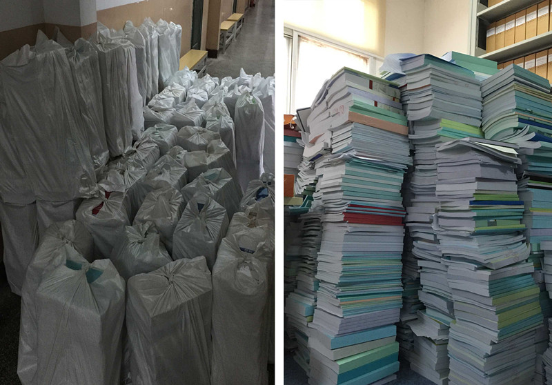 2015年暑假,165个项目,预算总金额20877万元,单日连续开标14小时,单日开标14个项目,单日开招标会议费发票196张,厚厚的一沓,取开连起来长达27米。废旧的标书堆积如山,装了整整500麻袋……