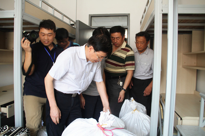 在学生生活组团,学生行李物品搬迁工作正在紧张进行。李家俊详细了解了学生宿舍的搬迁计划和进度,对校相关部门及搬迁公司的工作人员进行慰问,并进入宿舍楼内察看行李物品的存放情况。他嘱咐现场人员仔细核对宿舍和学生行李的信息,保证不出差错,使新生开学后能够及时使用,安心入住。