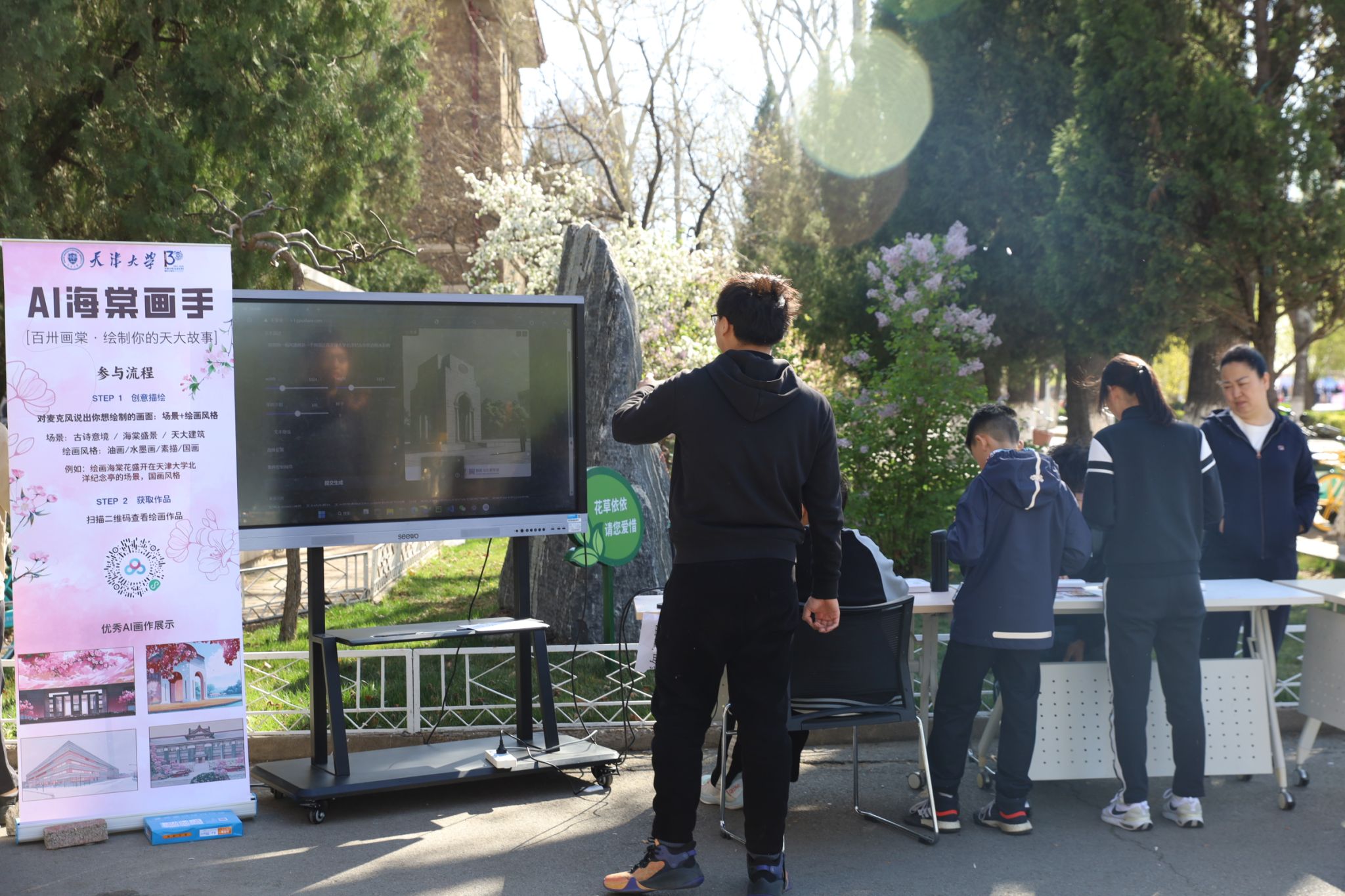 依托前沿人工智能技术,融入天大特色,AI绘画展位可实时生成游客心中的诗意画面——或是天大校园的巍峨地标,或是春日海棠的绚烂盛景。水墨氤氲间,主楼巍然矗立;油彩斑斓处,海棠纷飞点缀。通过AI艺术创作,展现百年学府的人文底蕴,为天津大学建校130周年献上一份科技与诗意交融的独特贺礼。
