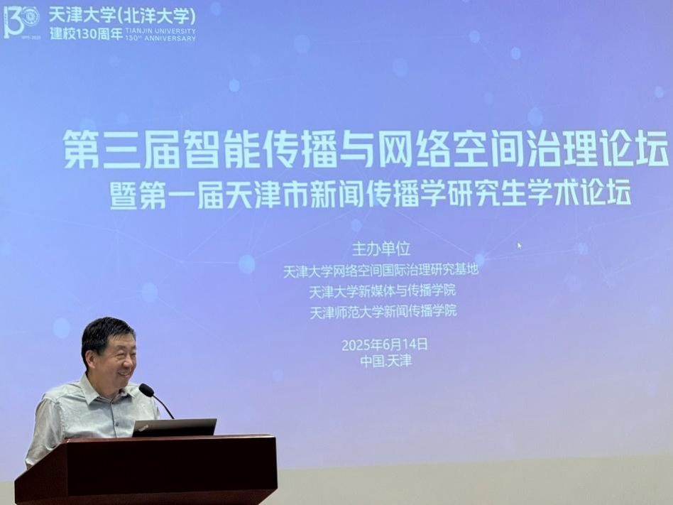 本站讯(文/刘衡)6月14日,第三届智能传播与网络空间治理论坛暨第一届天津市新闻传播学研究生学术论坛在天津大学卫津路校区成功举办。本届论坛由天津大学网络空间国际治理研究基地、天津大学新媒体与传播学院、天津师范大学新闻传播学院联合策划举办。天津大学新媒体与传播学院院长、讲席教授陆小华,天津大学新媒体与传播学院党委书记王赞,天津师范大学新闻传播学院党委书记张家玥出席论坛开幕式,开幕式由天津大学新媒体与传播学院党委副书记、副院长李晋馥主持。