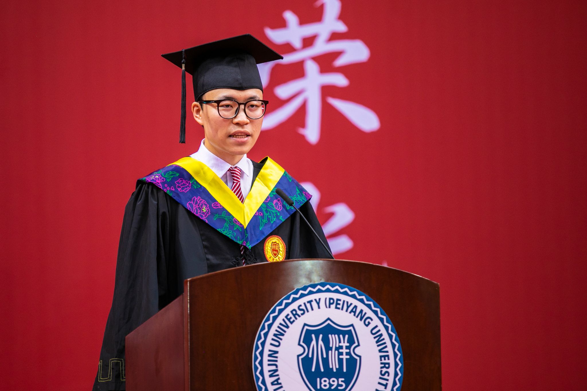 化工学院本科生孙圣真智作为毕业生代表发言,分享了自己在天津大学求学求知的难忘经历:“大二学年,在师友引领下我有幸提前进入实验室,接触了生物质能源领域,怀着将废弃木材转化为高能航天燃料的探索热情,工作至凌晨成为常态。面向当前‘双碳’目标,我选择电合成生物质的研究方向,继续在天大化工深造,向着新利18网址登录