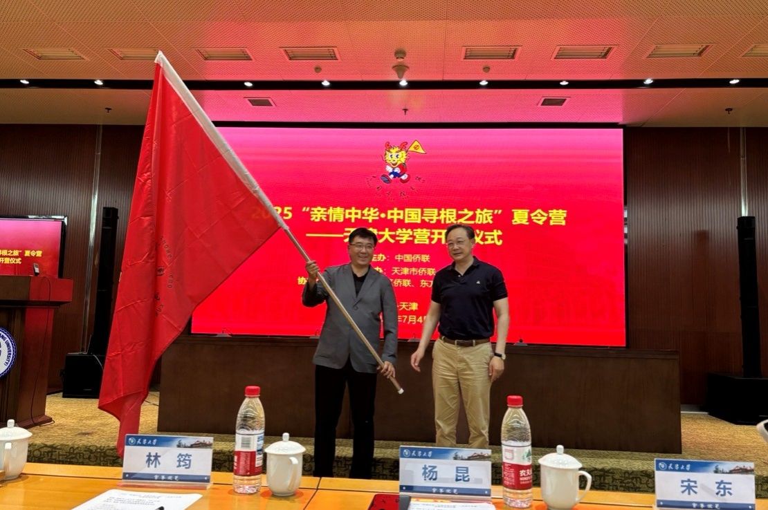 开营仪式上,杨昆受中国侨联副主席、天津市侨联主席李占勇的委托为天津大学营授旗。
