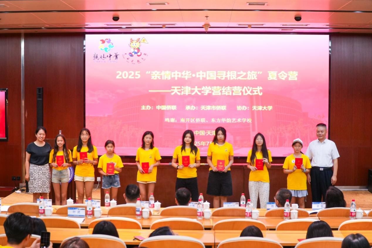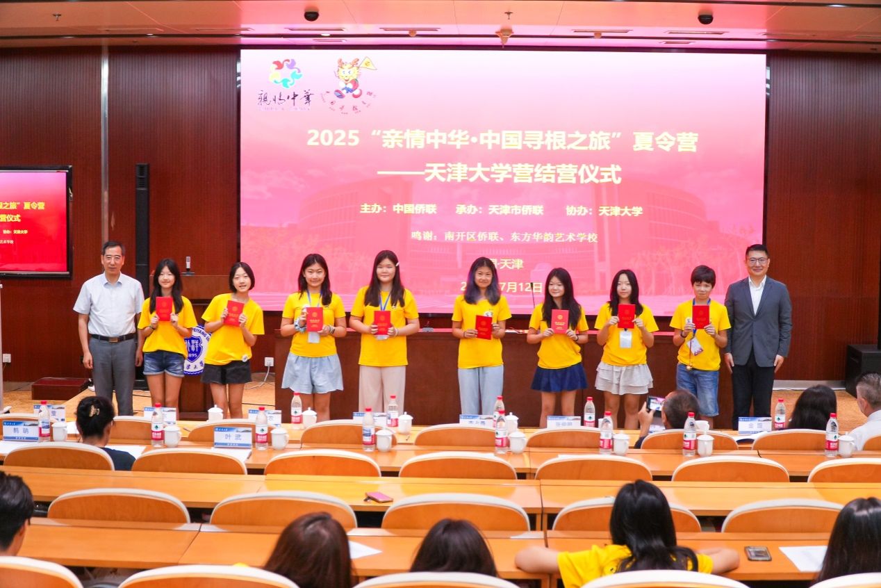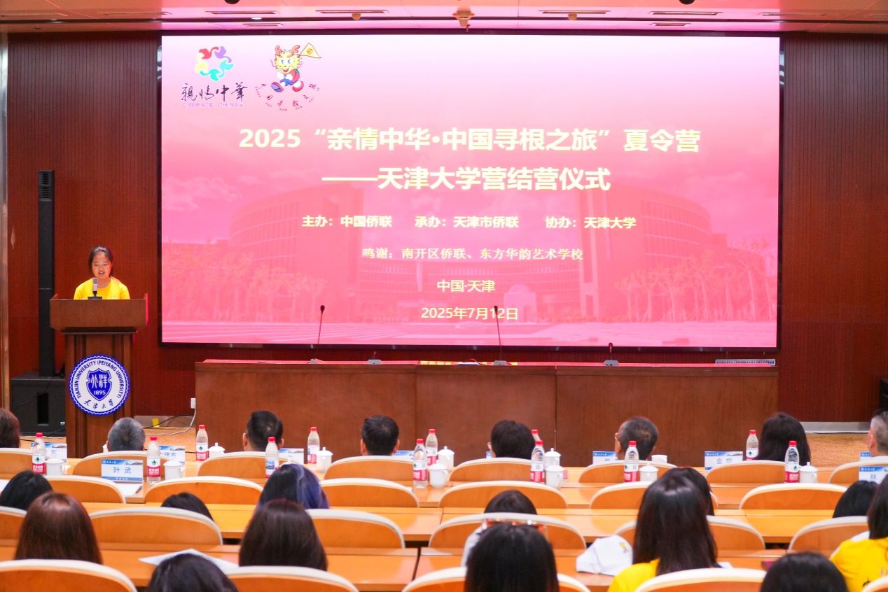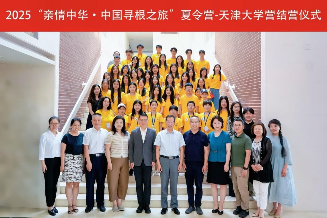 7月12日,2025“亲情中华•中国寻根之旅”夏令营天津大学营结营仪式在天津大学北洋园校区隆重举行。中国侨联副主席、天津市侨联党组书记、主席李占勇,天津大学副校长明东,天津大学党委常委、统战部部长张俊艳,天津大学国际教育学院党委书记金旋,天津市侨联社会工作联络部副部长张建农,天津市侨联社会工作联络部二级调研员杨泽桐,天津市南开区侨联主席、天津市侨联常委宋东,天津大学党委统战部副部长王莹与远道而来的瑞典行知学堂校长肖勇、领队以及42名充满活力的瑞典青少年营员齐聚一堂,共同见证这满载收获与情谊的动人时刻。