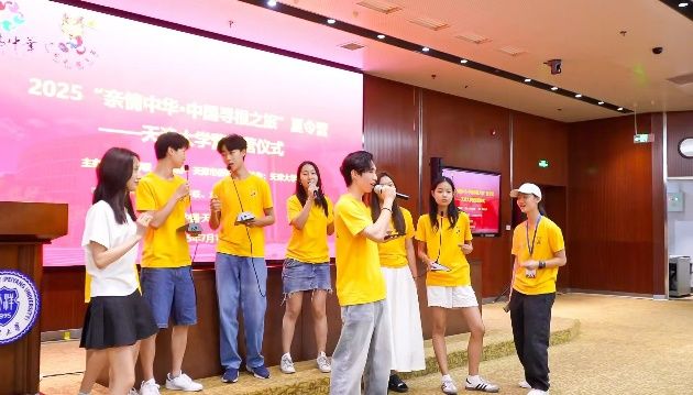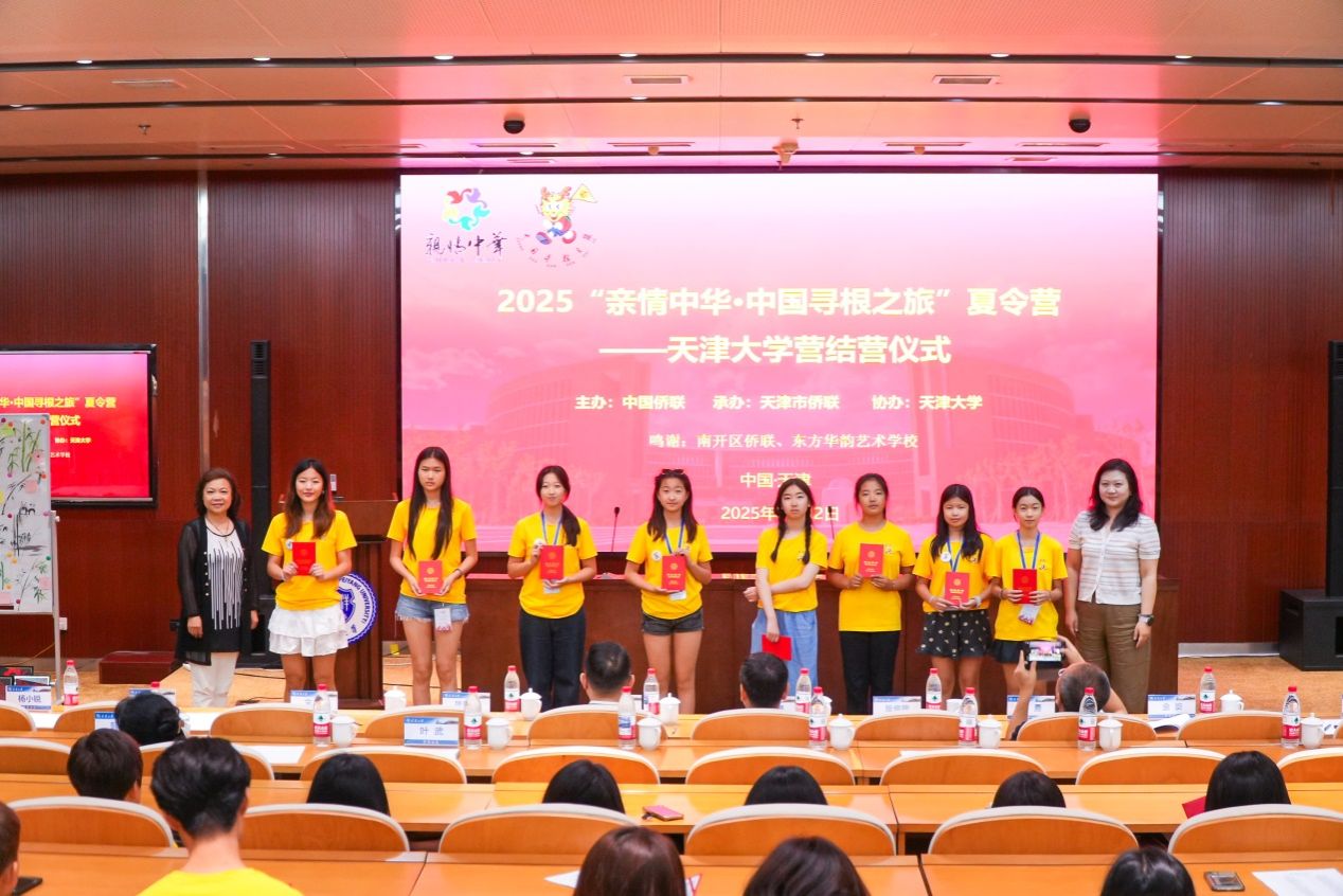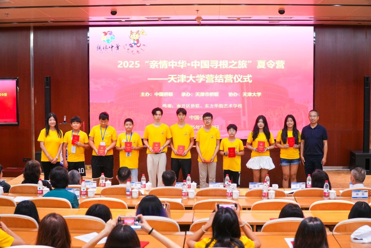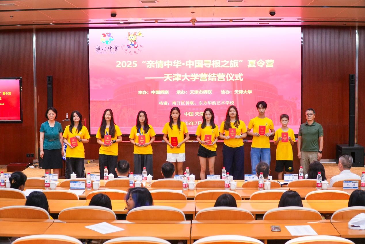 7月12日,2025“亲情中华•中国寻根之旅”夏令营天津大学营结营仪式在天津大学北洋园校区隆重举行。中国侨联副主席、天津市侨联党组书记、主席李占勇,天津大学副校长明东,天津大学党委常委、统战部部长张俊艳,天津大学国际教育学院党委书记金旋,天津市侨联社会工作联络部副部长张建农,天津市侨联社会工作联络部二级调研员杨泽桐,天津市南开区侨联主席、天津市侨联常委宋东,天津大学党委统战部副部长王莹与远道而来的瑞典行知学堂校长肖勇、领队以及42名充满活力的瑞典青少年营员齐聚一堂,共同见证这满载收获与情谊的动人时刻。