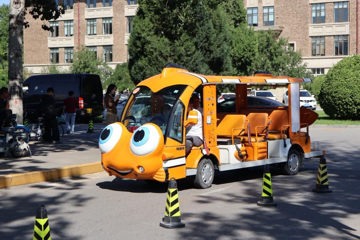 校园内,数十辆接驳车忙碌地穿梭于各主干道,将新生精准送达学院报到处、宿舍楼和生活服务点。其中,一辆造型萌趣、形似卡通小鱼的电瓶车成为“人气担当”。它瞪着大大的眼睛,扬起俏皮的微笑,仿佛从动画世界“游”进了现实,为新生的入学记忆添上一抹灵动与温暖。