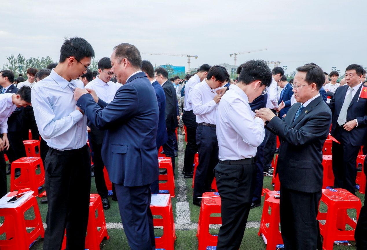 开学典礼前,新生代表、北洋合唱团分别带来了精彩的暖场表演,全体师生用歌声唱响爱国情,《歌唱祖国》的激昂旋律与百卅学府的青春血液交相辉映。典礼过程中,校领导还为新生代表佩戴校徽。现场师生共同观看了校友校史AI视频《兴学强国天大人》,借助AI技术完成了一场与先贤的时空对话。