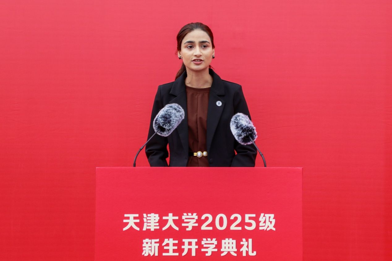 “无论你来自哪里,天津大学都将成为你追逐梦想、展现潜能的新起点。”来自巴基斯坦的医学部马思安作为留学生新生代表发言,百卅天大的学术底蕴和人文气息让她决定在这里继续深造,她愿用所学知识深化中巴友谊,与全体新生一起创造更美好的未来。