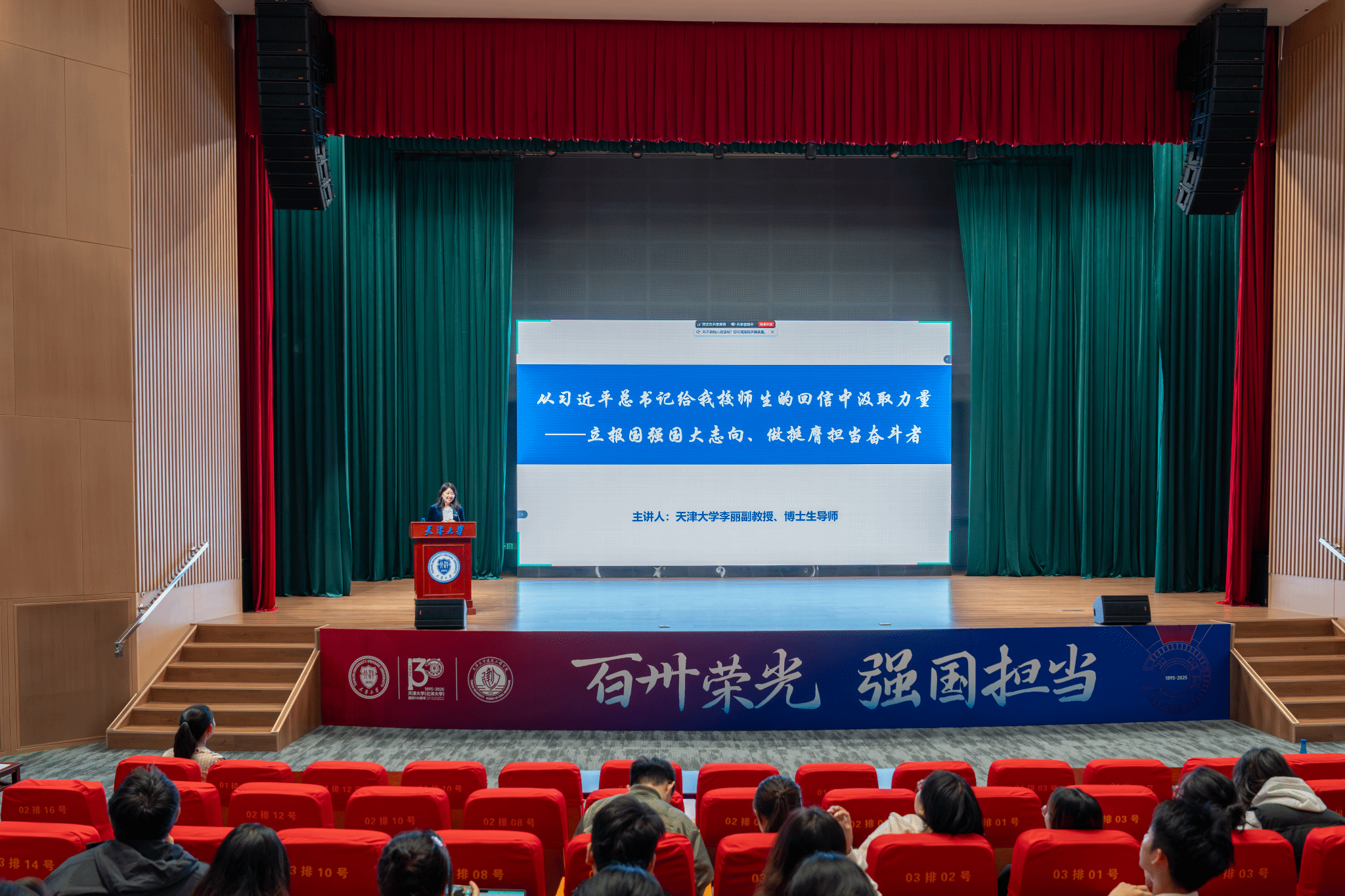 开班仪式结束后,天津大学马克思主义学院教师李丽为全体学员作题为《从习近平总书记给我校师生的重要回信中汲取力量——立报国强国大志向、做挺膺担当奋斗者》的主题报告。李丽带领学员重温习近平总书记给我校师生的回信精神,结合学校130年办学历程,生动讲述天大从“兴学强国”到“强国有我”、从“北洋大学”到“世界一流”的奋进之路,引导学员深刻体悟“矢志创新”“敢为天下先”“不在纸上逞空谈,要实地把中华改造”等信念在一代代天大人身上的赓续传承。她号召全体学员从重要回信中汲取信仰力量,心系“国家事”、肩扛“国家责”,立报国强国大志向,做挺膺担当奋斗者。