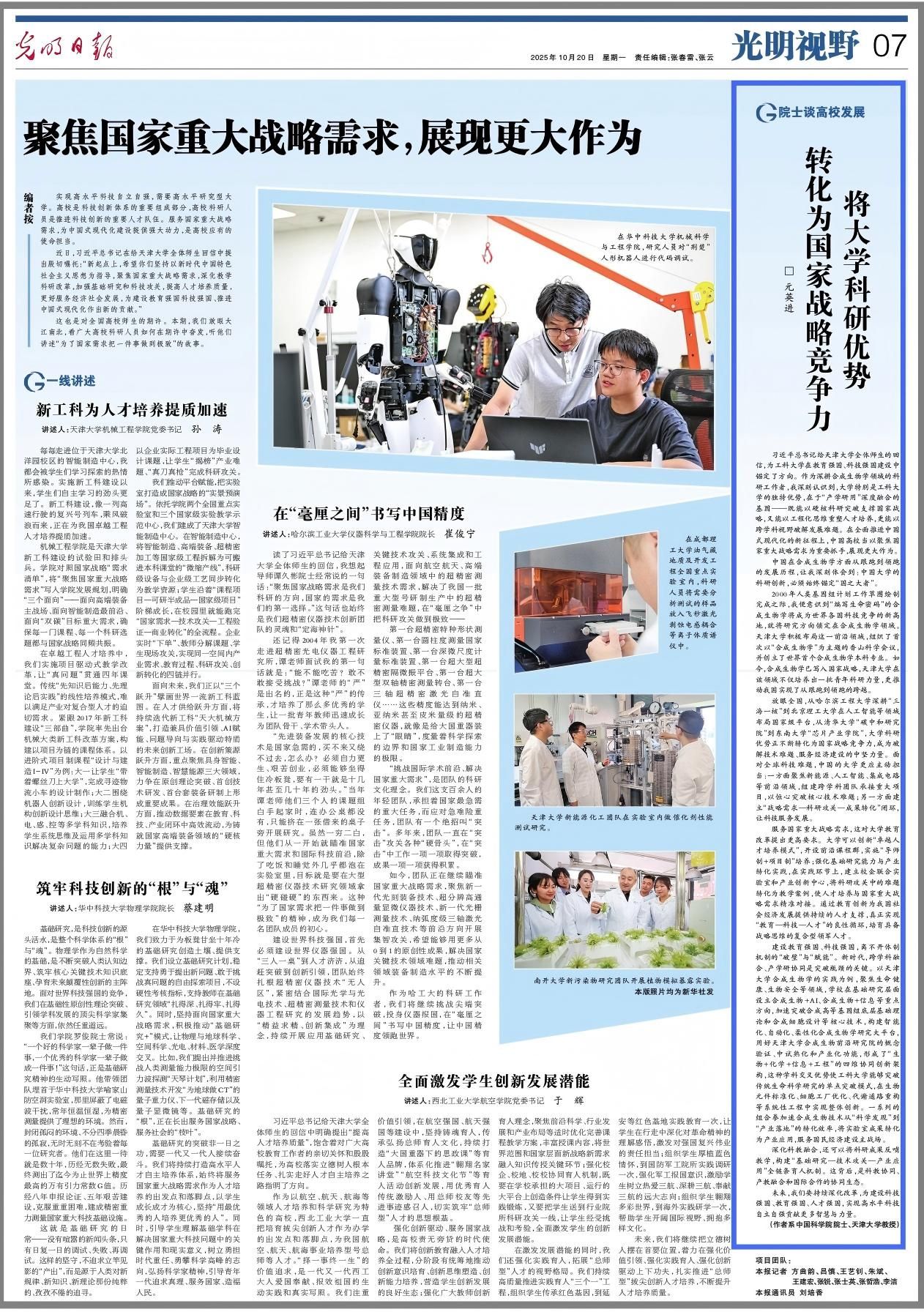 突破支撑国家战略,又能以工程化思维重塑人才培养,更能以跨学科视野破解发展难题。在全面推进中国式现代化的新征程上,中国高校当以聚焦国家重大战略需求为重要抓手,展现更大作为。