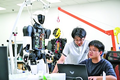 在华中科技大学机械科学与工程学院,研究人员对“荆楚”人形机器人进行代码调试。新华社发