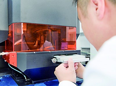 人员将需要分析测试的样品放入飞秒激光剥蚀电感耦合等离子体质谱仪中。新华社发