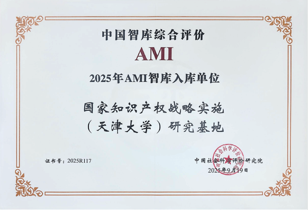 近日,由中国社会科学评价研究院主办、中国社会科学评价研究院机构与智库评价研究室承办的第八届中国智库建设与评价高峰论坛在北京中国历史研究院举行。会上公布中国智库综合评价研究项目(2025)评审结果,国家知识产权战略实施(天津大学)研究基地(以下简称“研究基地”)成功入选“中国智库综合评价2025年AMI智库”名单。