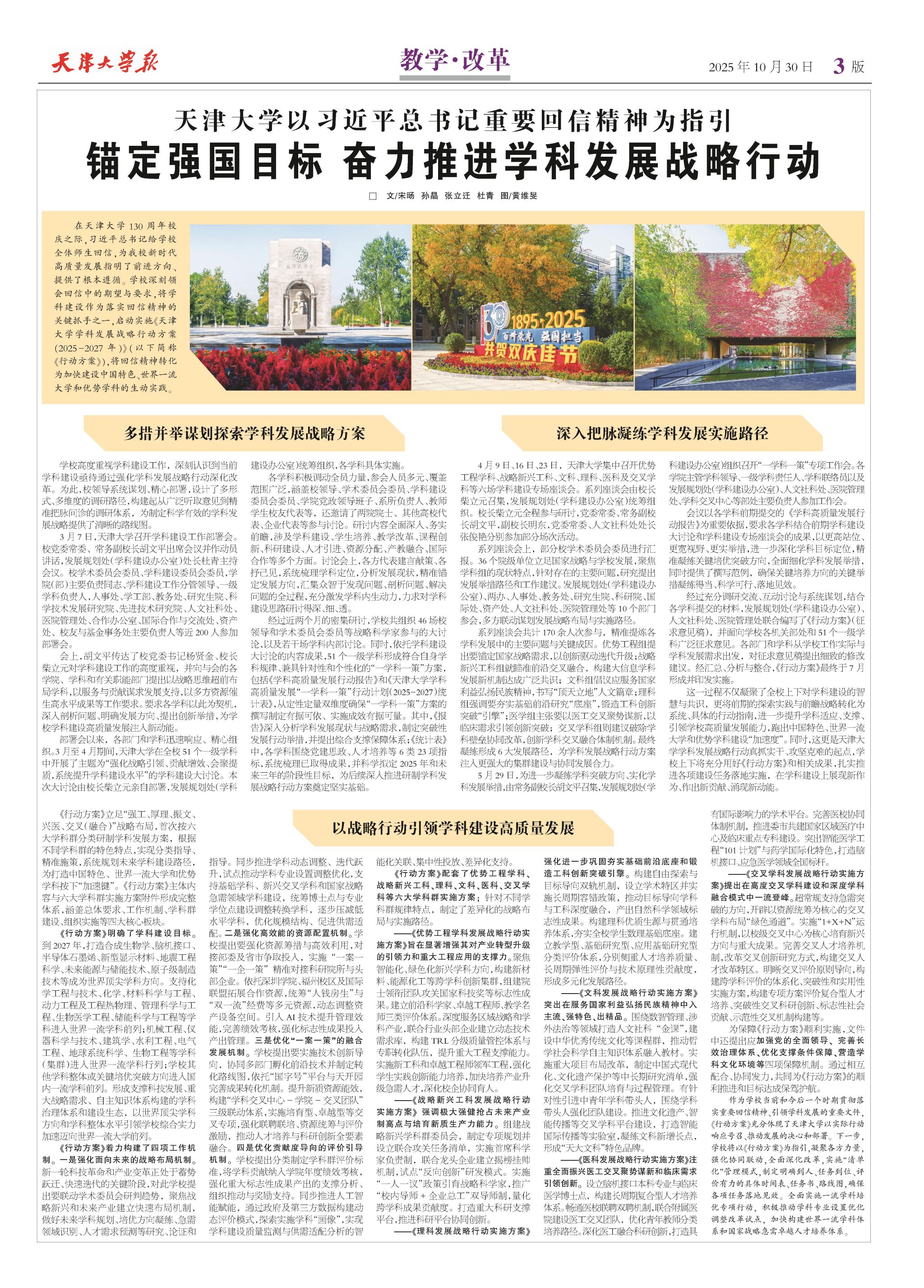在天津大学130周年校庆之际,习近平总书记给学校全体师生回信,为我校新时代高质量发展指明了前进方向、提供了根本遵循。学校深刻领会回信中的期望与要求,将学科建设作为落实回信精神的关键抓手之一,启动实施《天津大学学科发展战略行动方案(2025-2027年)》(以下简称《行动方案》),将回信精神转化为加快建设中国特色、世界一流大学和优势学科的生动实践。