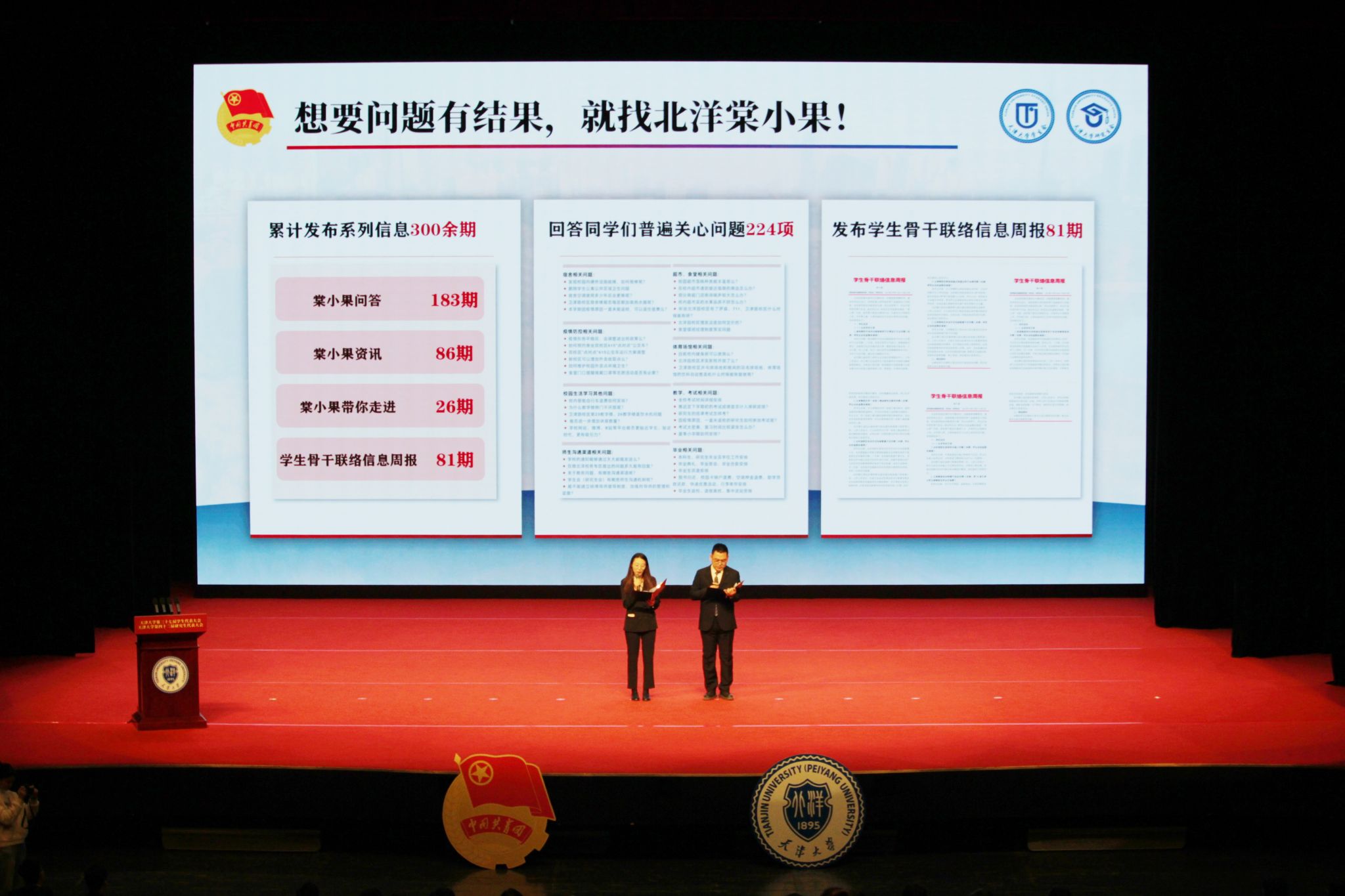 天津大学学生会组织进行“与‘棠小果’携手向未来”主题汇报。 “棠小果”与学生会组织深度融合,在思想引领、权益服务、成长赋能、文化建设等领域持续发力,成为学生会组织服务同学最闪亮的品牌。过去一年,“棠小果”累计发布100余期信息,包含“棠小果”资讯、“棠小果”新生指南、“棠小果”带你走进等栏目,阅读量超20万,同学们关心的校园大小事,都能在这里找到答案。学生会组织向校内各单位发出感谢信,真诚感谢他们作为“棠小果”的好朋友,始终支持并指导学生会、研究生会更好为广大同学做好服务。