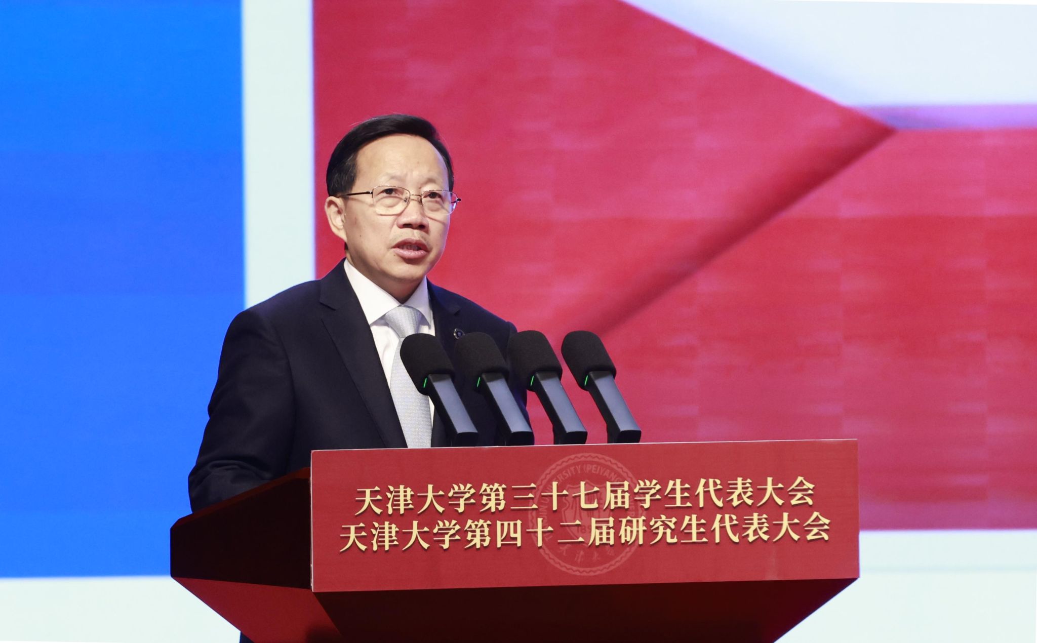2025年11月16日下午,天津大学第三十七届学生代表大会、第四十二届研究生代表大会于北洋园校区求实会堂召开,来自各学院(部)的近500名本科生代表、研究生代表参加会议。校长柴立元,校党委常委、组织部部长赵金铎,党办校办、宣传部、学工部、保卫部、教务处、研究生院、信网中心、校团委、后勤基建部、体育部等单位负责同志,各院级党组织副书记、团组织书记、学生会指导教师、研究生会指导教师出席会议。天津市学联执行主席李堃、清华大学研究生会主席团成员崔瀚文应邀出席。