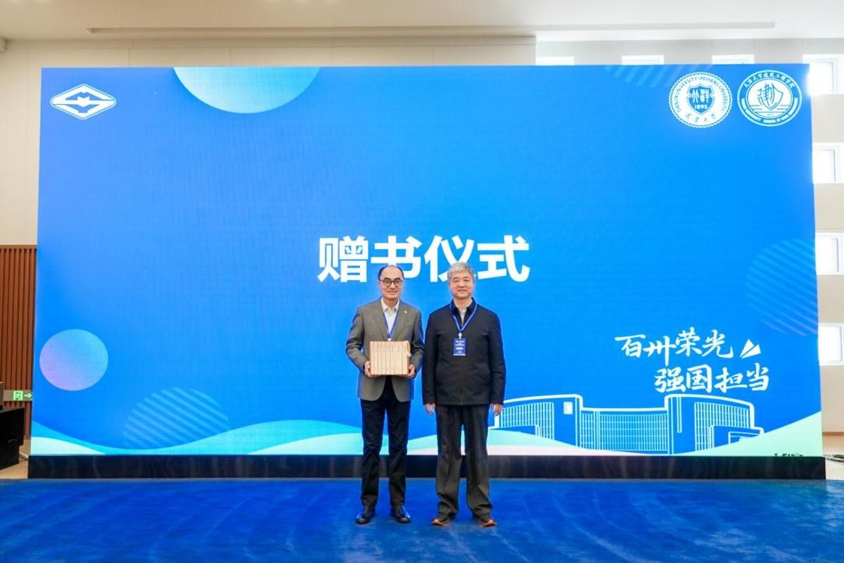 刘晓光代表北京茅以升科技教育基金会向天津大学赠送《茅以升全集》,天津大学党委学工部部长赵欣代表学校接受赠书。
