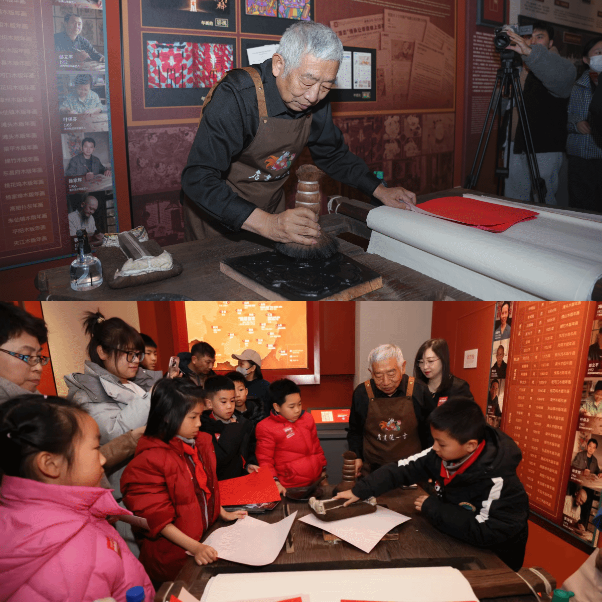 中国年画史馆的活动内容尤为丰富。观众跟随年文化主题讲解,探寻年的起源,了解年画背后的历史文化;在吉祥走廊用各式各样的吉祥符号心愿贴,制作一张属于自己的“马上有X”吉祥卡;在北方过年实景空间请灶王、品糖瓜,重温祭灶习俗;还能观看《大过新年》沉浸式视频,体味“以画过年”的津味年韵。年画史馆设有“细活”和“粗活”两个年画作坊,两位年画传承人在此带大家互动体验。王学勤站在炕头上,演示“粗活”技艺,讲解缸鱼年画寓意与贴法;霍庆有则带来一块福字印版,奔马、聚宝盆、弓箭图案寓意马到成功、财富丰盈,师生们纷纷拓印揭福。