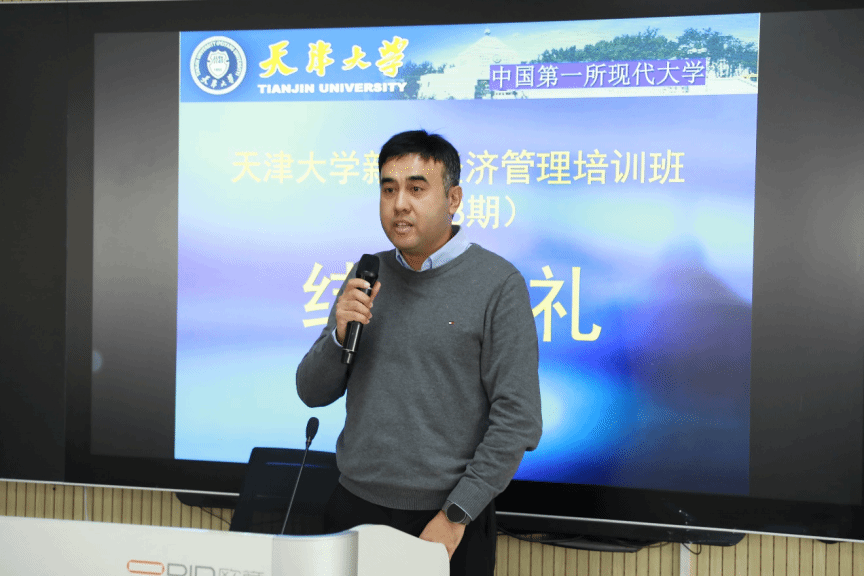 随后,学员代表木合塔尔·买买提依明发言。他表示此次培训恰逢天津大学建校130周年、新疆与天津大学干部教育培训合作36周年的双重节点,意义非凡。有幸在这一历史时刻踏入百卅学府汲取知识、锤炼党性、拓展事业,不仅是一次业务充电,更是一场深刻的思想洗礼与能力重塑。代表学员郑重表态:今后要做终身学习的践行者;做学以致用的实干家;开展新疆与天大的项目合作联络,珍视对天津大学的深厚情谊。并要以坚定信念、饱满热情、务实作风投身新疆,建设美丽新疆,共圆祖国梦想的伟大实践,用优异成绩回报组织培养和人民期望。