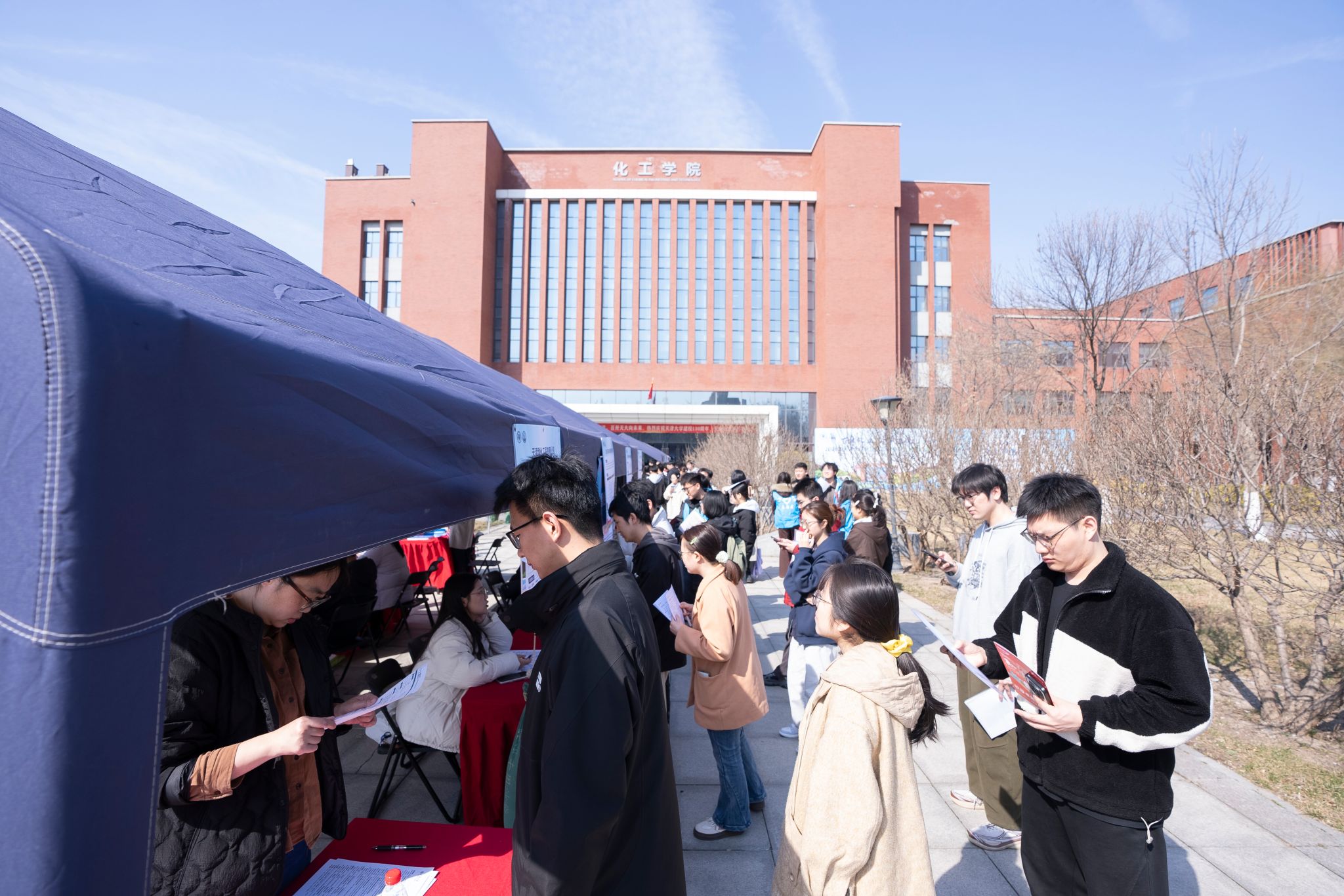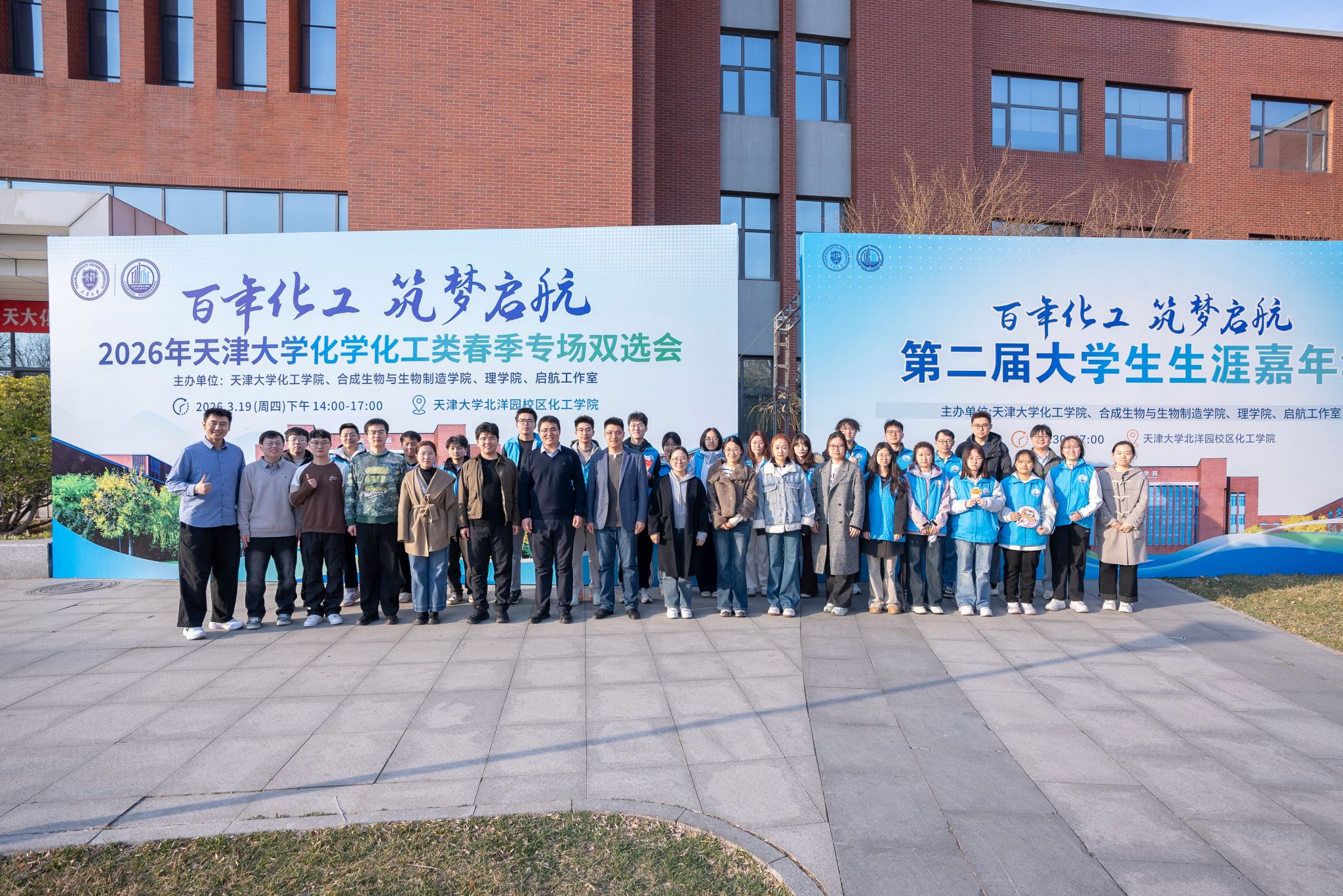 为提质增效做好学生就业指导服务,切实促进毕业生高质量充分就业,2026年3月18日,由天津大学化工学院、合成生物与生物制造学院、理学院、启航工作室联合筹办的“百年化工 筑梦启航”——2026年天津大学化学化工类春季专场双选会暨第二届大学生涯嘉年华在化工学院50楼大厅和门口广场成功举办。本次双选会邀请到了中国工程物理研究院、中国化学集团、中国中化等央国企,以及多家校友企业、上市民企和地方企业等近百家单位共同参会,提供涵盖新能源、新材料、生命医药等领域的1000余个岗位,吸引近2000余名学生现场参与。