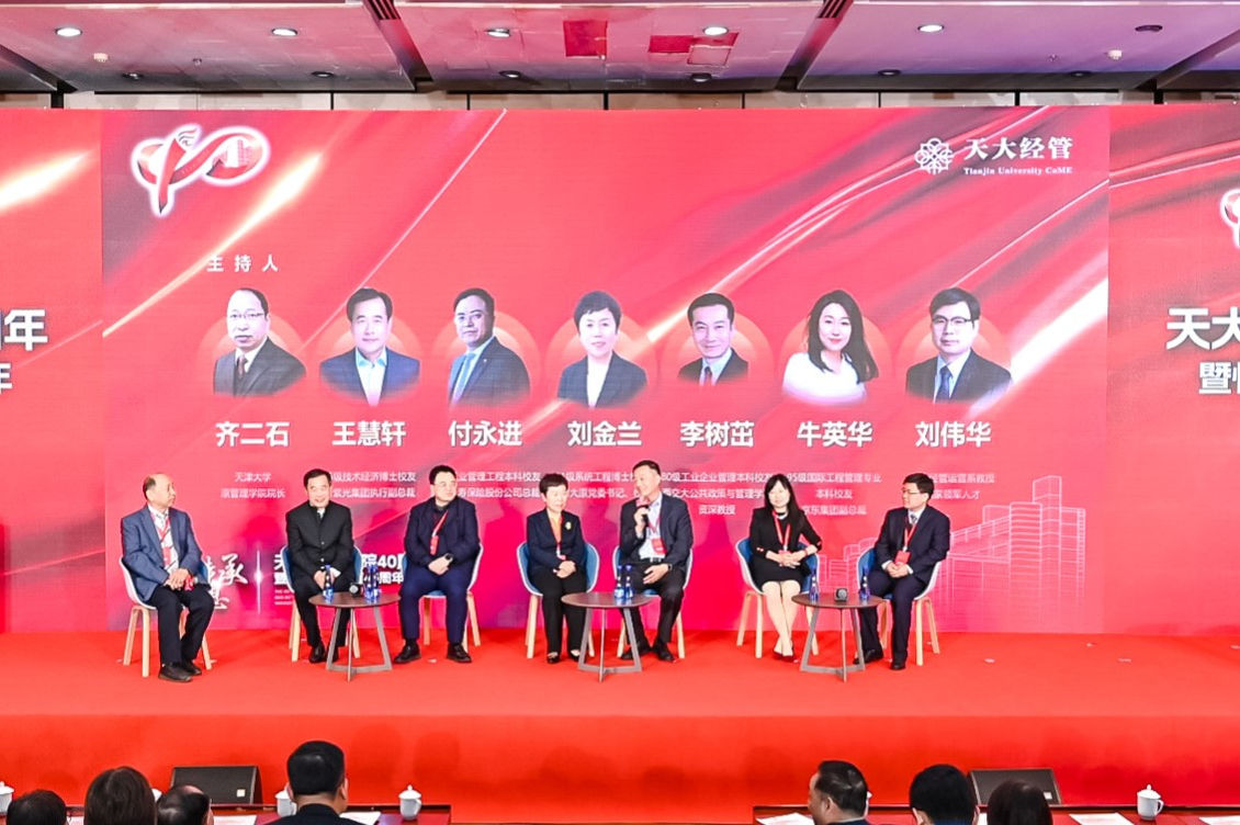 圆桌论坛环节,1991级系统工程博士校友、天津财经大学原党委书记、校长刘金兰,1980级工业企业管理本科校友、西安交通大学公共政策与管理学院资深教授李树茁,1989级工业管理工程本科校友、国华人寿保险股份公司总裁付永进,2005级技术经济博士校友、新紫光集团执行副总裁王慧轩,1995级国际工程管理专业本科校友、京东集团副总裁牛英华,天津大学讲席教授、国家级领军人才、运营与供应链管理系主任刘伟华上台展开交流,回忆天大求学美好时光,畅谈学部未来发展,积极建言献策。论坛由天津大学原管理学院院长齐二石主持。