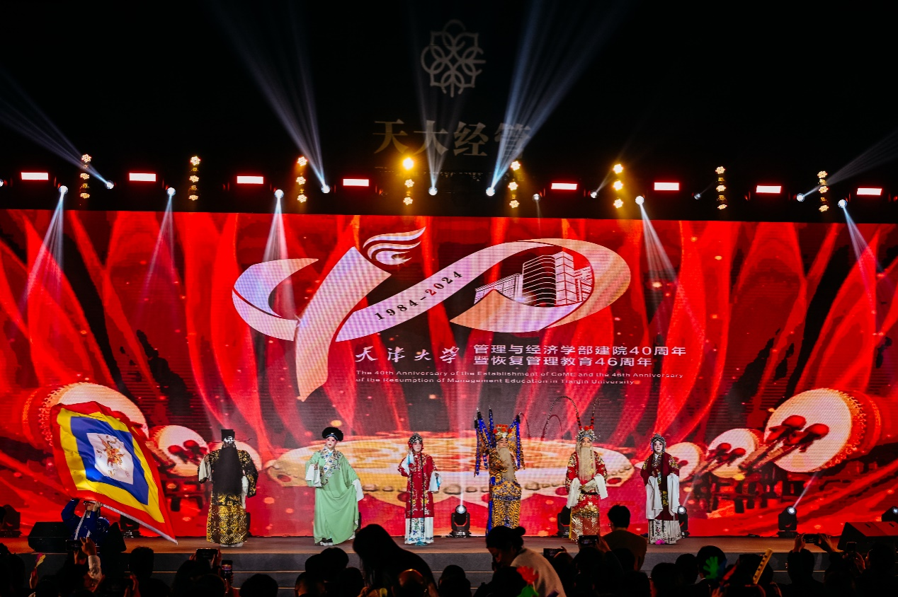 主题晚会由栉风沐雨,薪火永续;四秩传承,笃行不息;携手共进,华章待启三个篇章组成,于天津大学卫津路校区体育馆举办。这场由天津市社会团体、曲艺名家、经管学部师生、校友共同呈现的晚会,包含了戏曲、曲艺、歌曲、舞蹈、朗诵等多个节目,这不仅是一场精彩绝伦的视听盛宴,更是经管人精神风貌与深厚情怀的生动诠释。