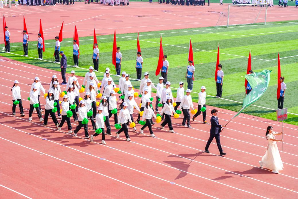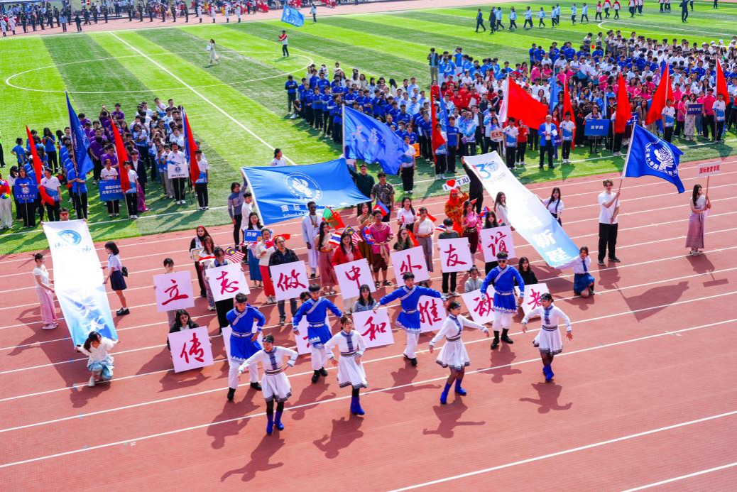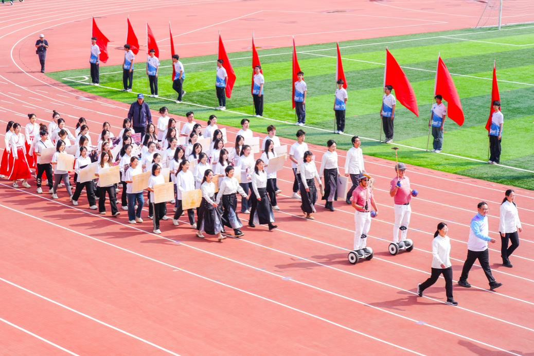 伴随着激昂的《运动员进行曲》,入场式开始,全体运动员以饱满的热情、整齐的步伐列队入场。化工学院师生手持花扇,托举起“百年化工,新质领航”的壮志豪情,以灵动韵律演绎学科百年征程;智能与计算学部传承北洋星火,“百卅年积淀铸就求是品格,七载智算磨砺科技锋芒”,借AI创新诠释新时代体育精神的时代内涵。“十探山河,百卅薪火相承”,地球系统科学学院用蓝白院旗辉映测绘蓝图,用地质锤与罗盘镌刻“勘天探地”的信仰,用“10”字队形诉说年轻学院与百年学府跨越时空的精神共鸣。人文艺术学院展示了《唐女马球图》,并穿插舞蹈《赛马》和平衡车马球手表演,弘扬马球文化。国际教育学院留学生方队身着绚丽多彩的民族服装昂首入场,他们将中国视为第二故乡,以饱满的热情高喊“五洲耀天大,百卅启新程”的口号,立志成为中外友谊的坚定传播者和有力推动者。各代表队依次走过主席台前,运动员们英姿勃发、气宇轩昂,“百卅荣光,强国有我”的青春誓言铿锵有力。他们挺拔的身姿和飞扬的神采,恰似跃动的音符,奏响天大学子赓续百年荣光、勇担强国使命的激昂乐章。