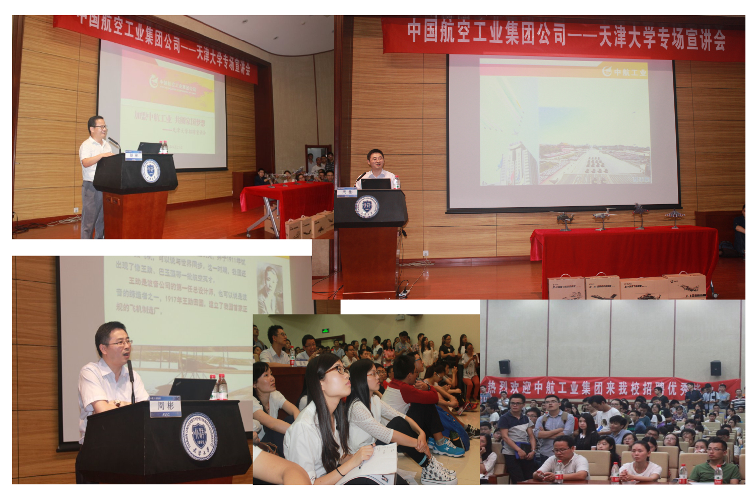 天津大学就业指导中心主任肖述虎主持宣讲会他首先对此次中航工业集团天大招聘毕业生表示热烈的欢迎,中航工业集团近年来对天大人才工作的大力支持表示衷心感谢。随后,周彬校友为天大的学弟学妹们作了内容精彩的报告。周彬校友自豪地向天大学子说,93阅兵中共有10个分队、17型号、183飞机飞过天安门,这些飞机全部来自于中航工业集团。为了活跃现场气氛,周彬通过现场提问与天大学子进行了互动,并为幸运观众颁发了歼-10、运-20等飞机模型。在接下来的报告中,周彬校友对中航工业的发展历史、当今综合实力以及企业未来发展等作了详细介绍,还对中航工业集团的招聘需求、晋升通道与薪酬制度等进行具体阐述