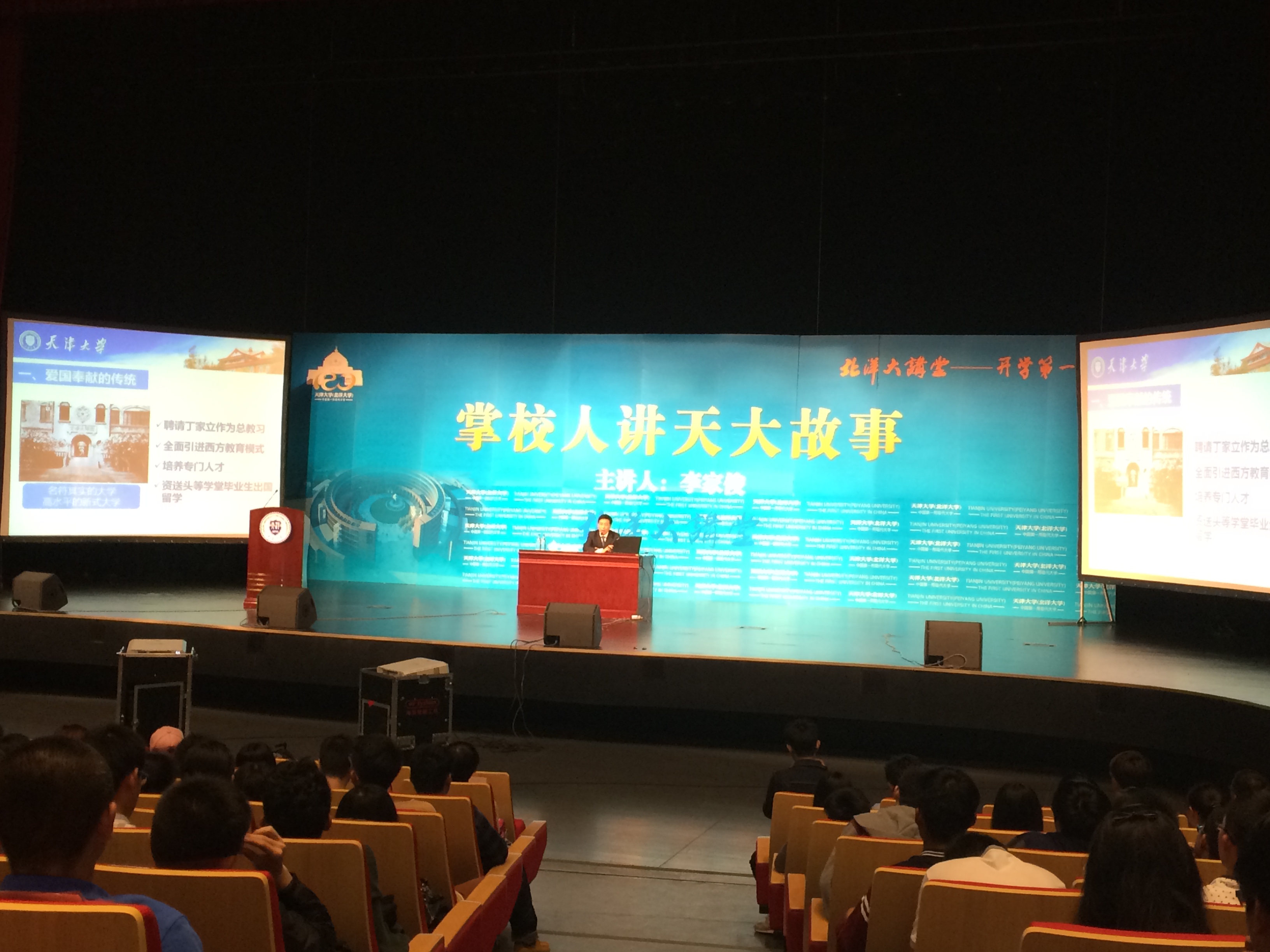 李家俊娓娓道来,图文并茂,为新生们上了一堂生动的校史课。他从北洋大学到天津大学,从“爱国奉献”的传统、“实事求是”的校训、“严谨治学”的校风到“兴学强国”的使命,概述了学校120年发展的轨迹,穿插讲述了学校的一些典型的生动故事,如“三问桥”、“七星灯火”、“北洋大学严进严出”、“茅以升造钱塘江大桥”、“校训的由来”及“高教60条”等故事,还向学子们介绍了学校培养的优秀校友。李校长说,“120年来,我们北洋人-天大人把民族独立作为人生追求,求爱国救国之是;把教育振兴作为人生追求,求高等教育发展之是;把国家富强作为人生追求,求民族振兴之是;把严谨治学作为人生追求,求人才培养之是。”“建校120年,北洋大学、天津大学为祖国培养了20万余名高层次人才:经济学家马寅初,外交家王宠惠、王正廷,数学家秦汾,著名诗人徐志摩,‘两弹一星’功臣吴自良、姚树人,国家最高科学技术奖获得者师昌旭等就是他们的代表。据不完全统计,学校校友中有“两院”院士60余位,大学校长50余位。中华人民共和国成立以来,学校培养了一大批高级领导干部、数百名国家特大型企业负责人和总工程师。”