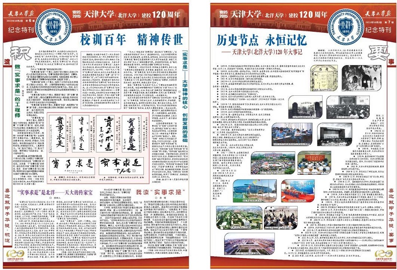 为迎接天津大学120周年校庆,由校报编辑部推出的《天津大学报》120周年校庆纪念特刊经撰写、编辑、拼版、审校、印刷等环节,历时5个月的筹备现正式出版发行。此特刊为对开彩色铜版纸大报,共12个版,图文并茂地展示了120年天大恢弘画卷和卓越成就。此特刊回顾了天津大学120年的历史篇章,纪念百廿辉煌。特刊共由13个版块组成,分别从校史、历史故事、历史名人、校训、历史大事、发展成就等方面介绍了学校的历史文化和继承发展。