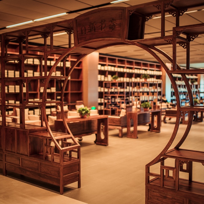 “二次创作”最突出的工作是在原功能布局基础上开发了两个“文眼”——日新书斋和特藏与文库阅览区:日新书斋选取馆舍四层西北角,完全用家具隔离出一个空间,配以明式实木家具和中国文化典籍,开发出一个充满浓郁中国古典文化气息的学习研讨场所。通过书墙家具配置,拓展原来单一的特藏阅览为特藏、文库、捐赠图书三合一的分级式阅览管理空间,并增加了陈列展示功能。新的功能拓展还体现在对休闲共享和视像阅览空间的分型开发上。通过“二次创作”,原来相对单一的休闲共享空间变成了分布馆内的读者休息、交流讨论、舒适阅读、休闲小品等多样化空间;选取三层南区半开放的小空间创设了一个20座位的适宜读者个体或小团组进行视像阅览和学习的功能区块,满足读者个性化学习的需求。这些空间的开发和功能塑造,不仅使图书馆更富文化意蕴,也使得整个空间更加灵动起来,已成为新校区图书馆最受瞩目和欢迎的亮点。