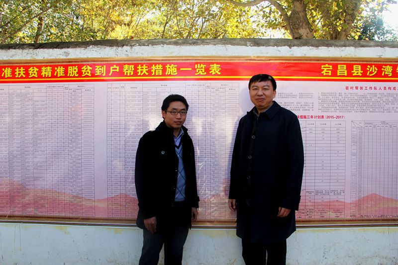 舒歌群与我校扶贫干部宋鹏在大寨村精准扶贫帮扶一览表前合影
