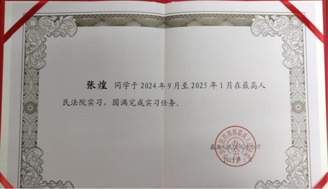 本站讯(法学院供稿)在培养德法兼修的高素质法治人才的时代号召下,2024年最高人民法院面向全国法学院校启动了第十五批法律实习生招募选拔工作。天津大学法学院积极响应最高人民法院法律实习生制度精神,高度重视实习生选拔培育工作,经过严格选拔与推荐,天大法学院知识产权法学2023级博士研究生谢艺婕(导师管荣齐教授)、民事诉讼法学2023级硕士研究生张煌(导师郭小冬教授)凭借扎实的专业知识、出色的综合素质和对司法实践的热忱,成功入选最高人民法院第十五批法律实习生项目,开启了在最高人民法院为期四个月的全职实习之旅。其中,张煌同学在实习期间表现突出,荣获最高人民法院“优秀法律实习生”荣誉称号。