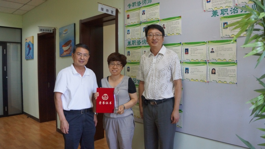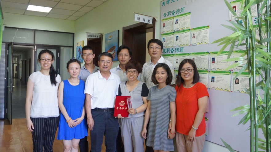 此奖项由中国心理卫生协会授予,统一在8月24日召开的第八次全国心理卫生学术大会现场颁发,但由于当时杨丽老师率领中心的团队入驻天津港口医院,参与 “8.12天津港事件”的灾后心理救援,错过了大会现场的颁奖仪式。受中国心理卫生协会理事长马辛教授委托,张金钟和毛富强两位老师将这一荣誉亲自交到杨老师手中,同时对杨老师个人在高校及注册系统中的工作表示充分肯定,鼓励天津大学心理健康教育中心在杨老师的率领下再创辉煌。