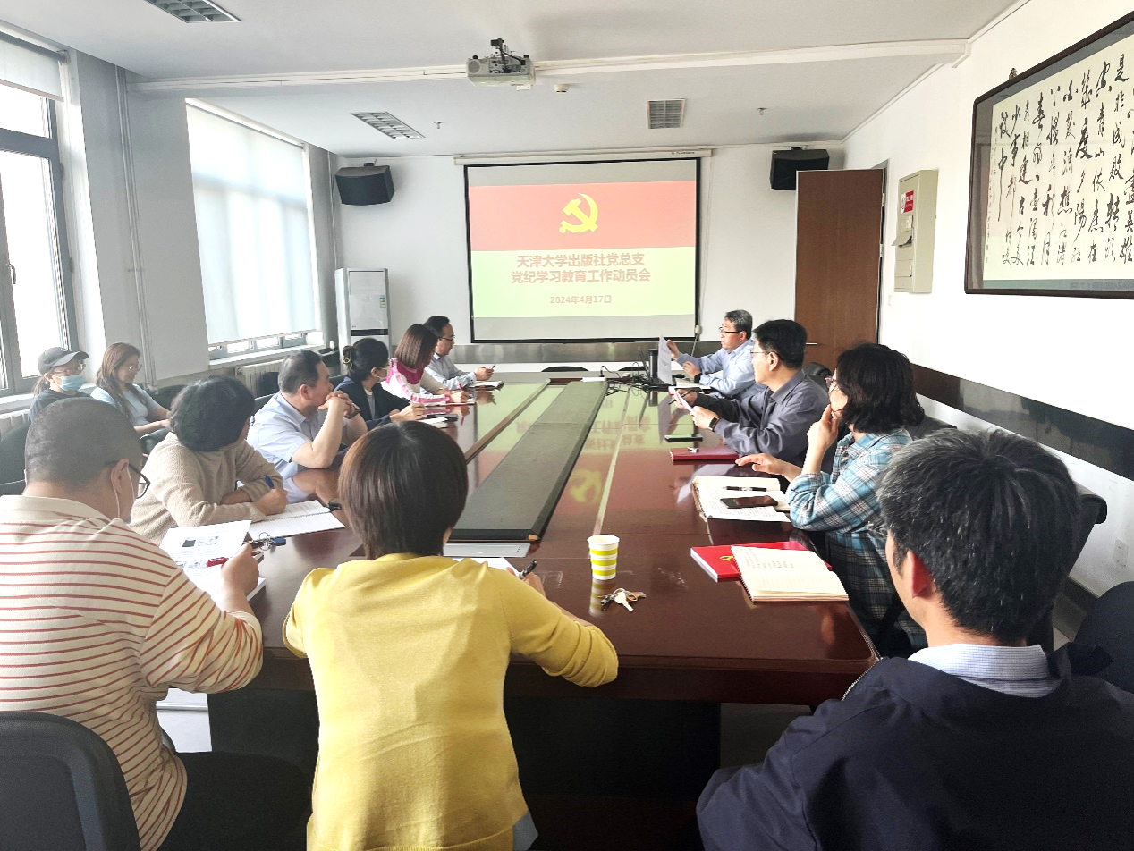 本站讯(出版社党总支供稿)4月17日,天津大学出版社党总支召开党纪学习教育工作动员会,认真学习《中共天津大学委员会关于在全校党员中开展党纪学习教育的工作方案》精神,部署出版社党纪学习教育工作。出版社党总支委员、社委会成员、全体在职党员参加了会议。会议由出版社党总支书记宋雪峰主持。