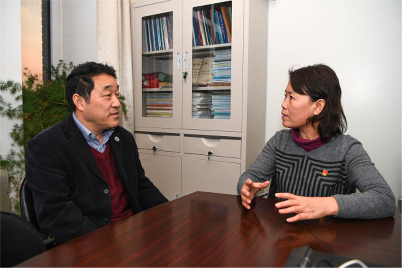 2017年12月13日,冯翠玲(左)和天津大学药学院人事干部、入党申请人闫梦龙交流学习十九大精神的心得体会。新华社记者 申宏 摄